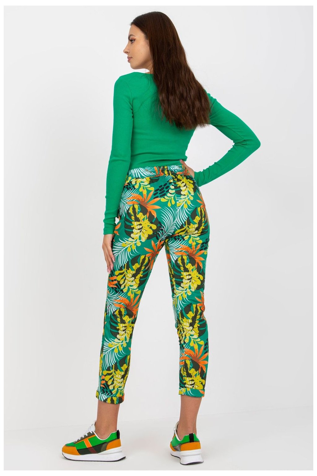 Dámské tepláky s elastickým pasem a zavazováním na šňůrku. Kapsy na bocích. Kalhoty ze vzorovaného materiálu.