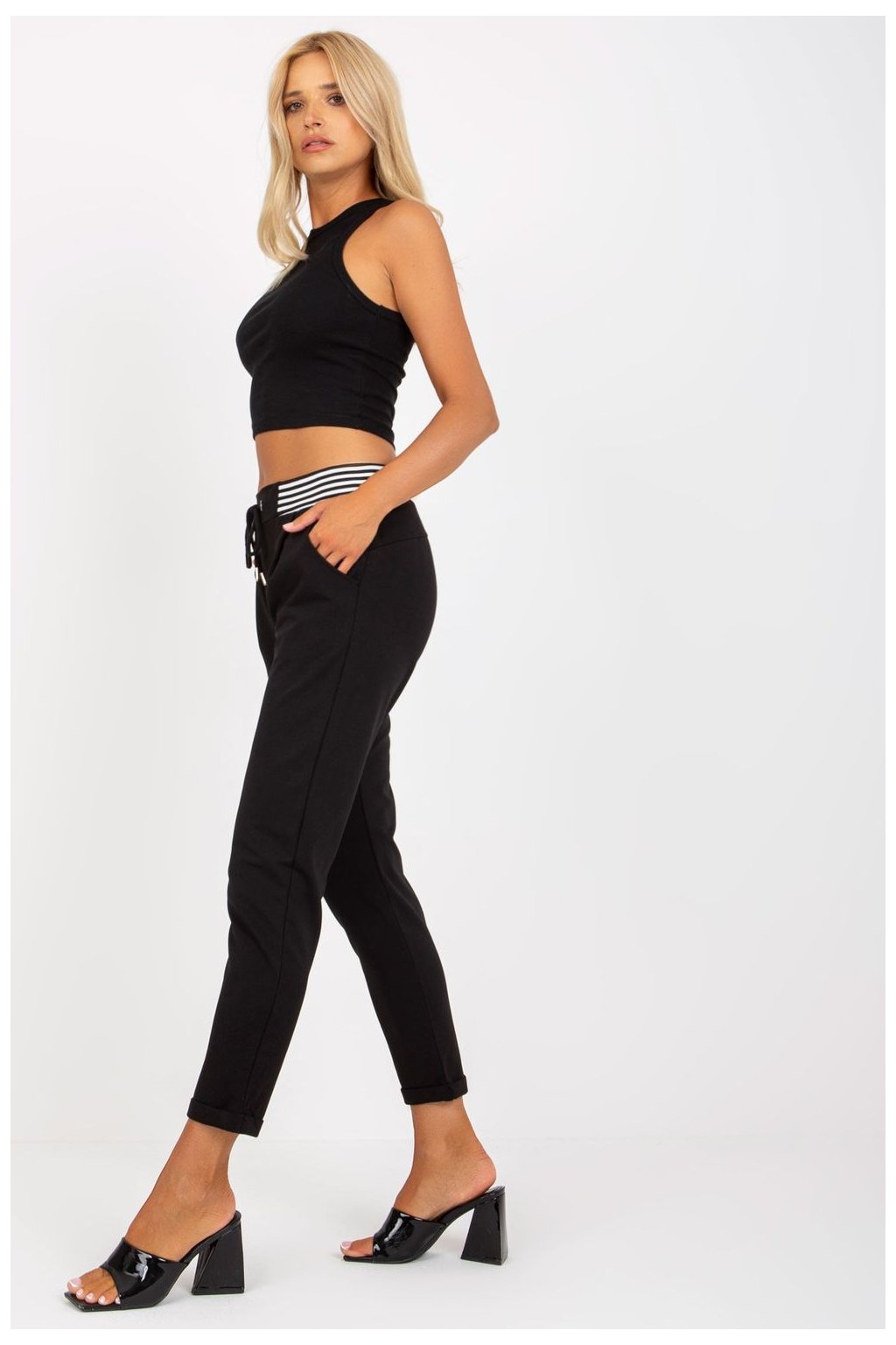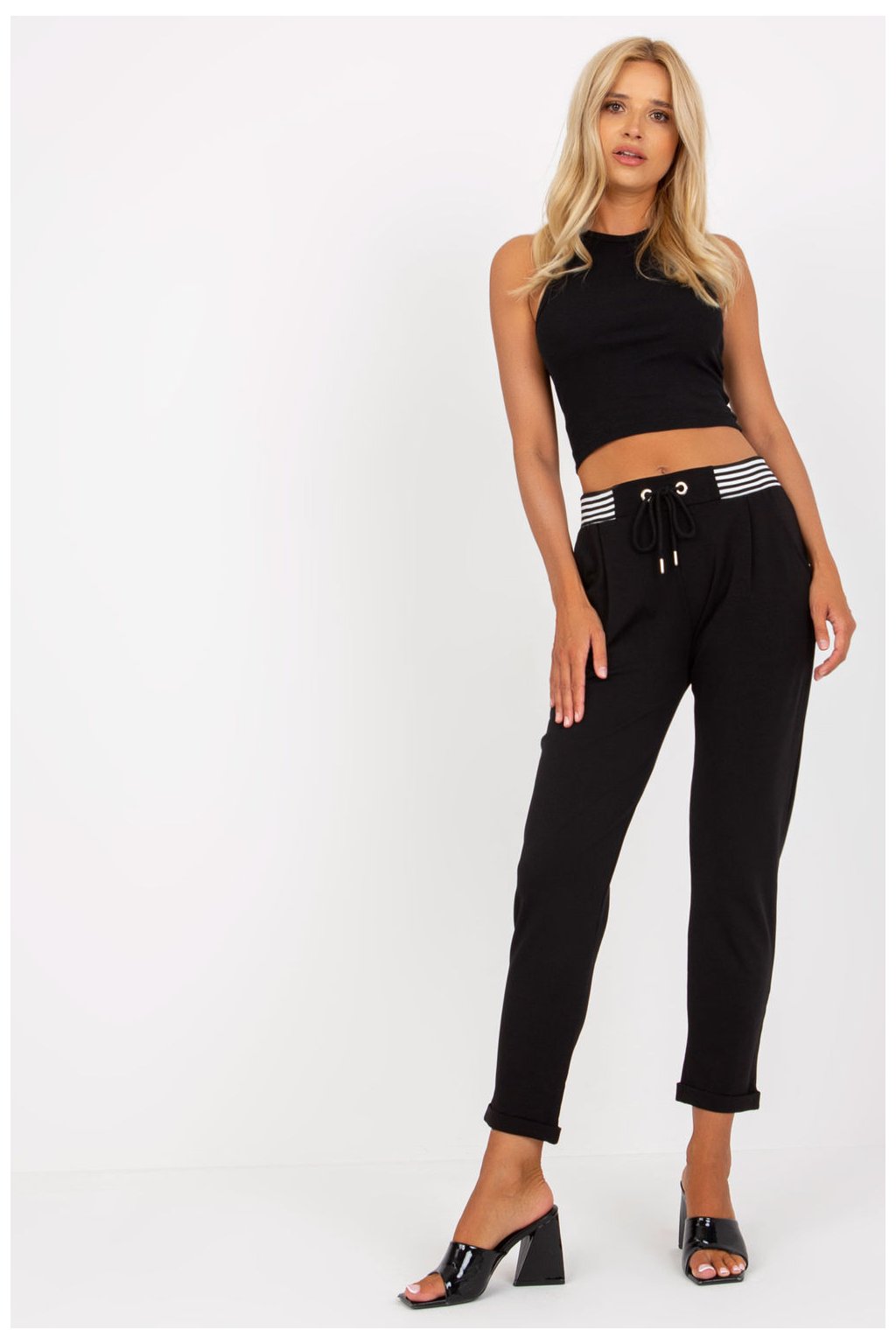 Dámské tepláky s elastickým pasem a vázáním. Kalhoty s vysokým pasem a nakládanými kapsami na bocích.