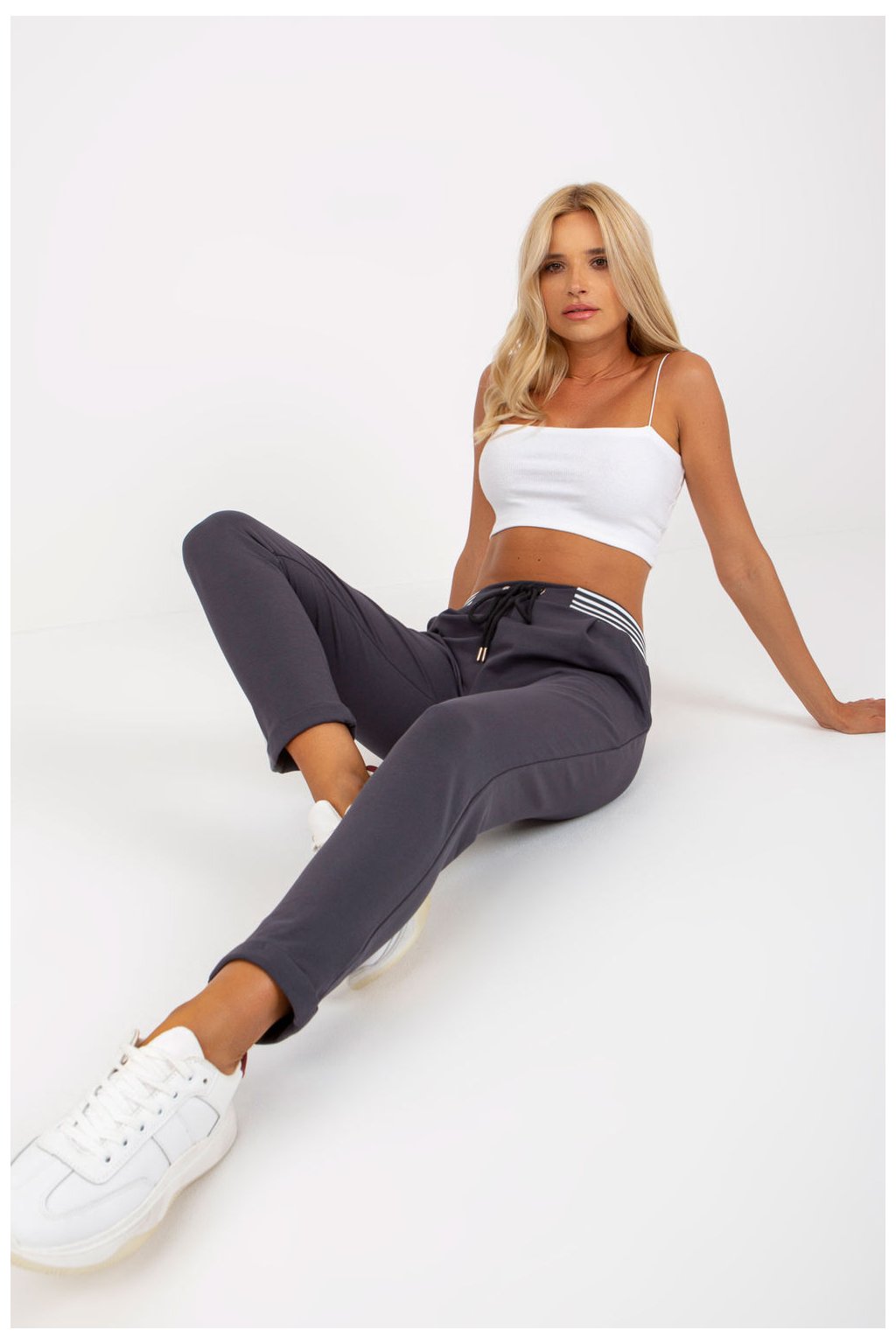 Dámské tepláky s elastickým pasem a vázáním. Kalhoty s vysokým pasem a nakládanými kapsami na bocích.