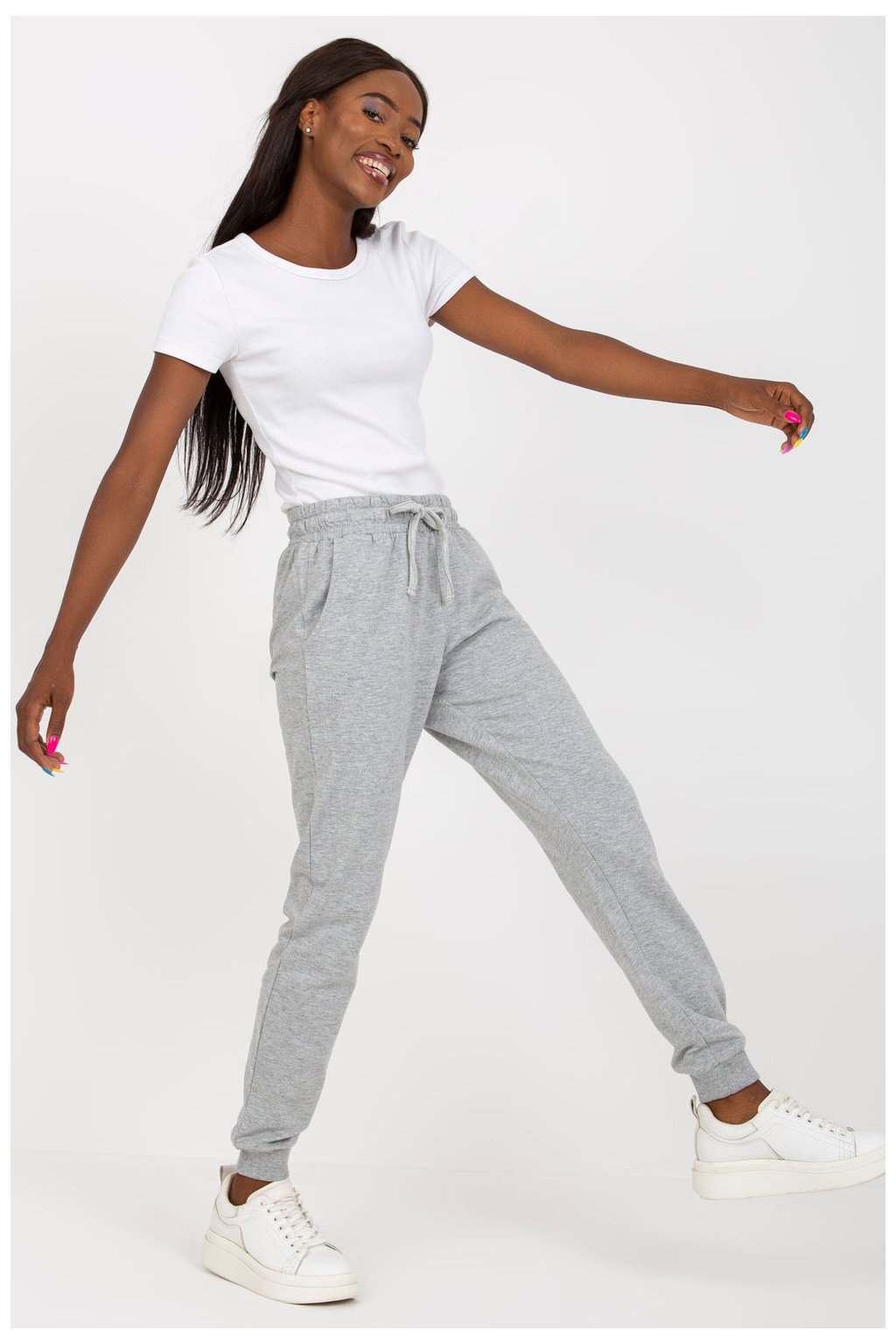 Tepláky s elastickým pasem, kapsy na bocích. Kalhoty s vysokým pasem a šňůrkou v pase.