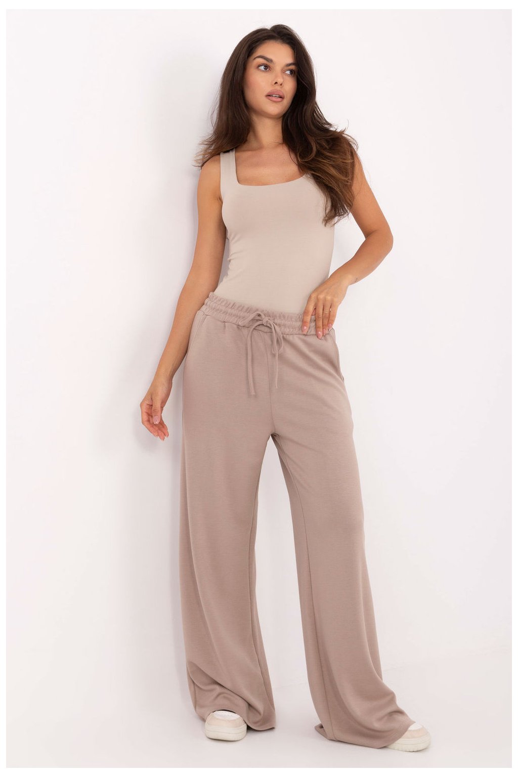 Kalhoty ve sportovním stylu casual, ideální na každý den. Vyrobena z měkké směsi viskózy, polyesteru a elastanu, poskytuje pohodlí, prodyšnost a lehkou pružnost materiálu. Hladká textura tkaniny jim dodává univerzální charakter, díky čemuž se snadno hodí do mnoha outfitů. Model se vyznačuje vysokým pasem a širokými nohavicemi, které se krásně skládají při pohybu, zdůrazňujíce volný střih. V pase je praktické šněrování, umožňující přizpůsobení siluetě, a boční kapsy dodávají funkčnost. Moderní a pohodlné, skvělá volba pro každodenní, casual outfity.