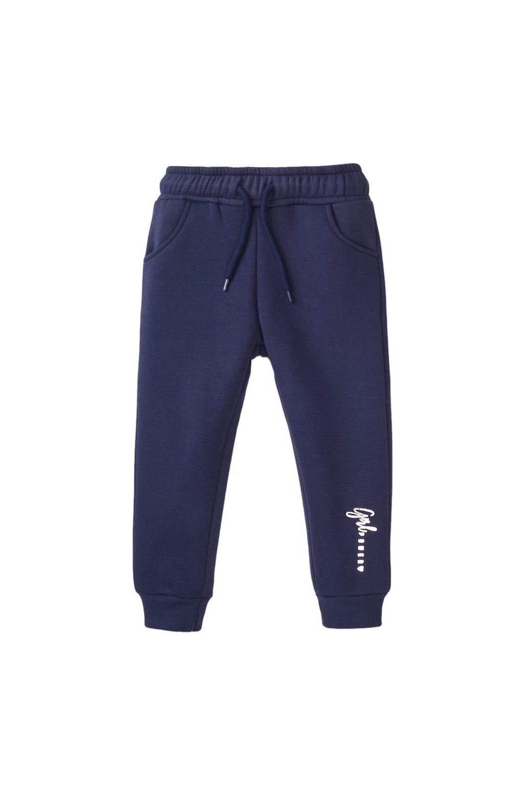 Měkké a pohodlné tepláky se svislými nápisy, kapsami a šňůrkou v pase. Praktická volba pro aktivní dívky - na každodenní nošení i na sportovní aktivity.
