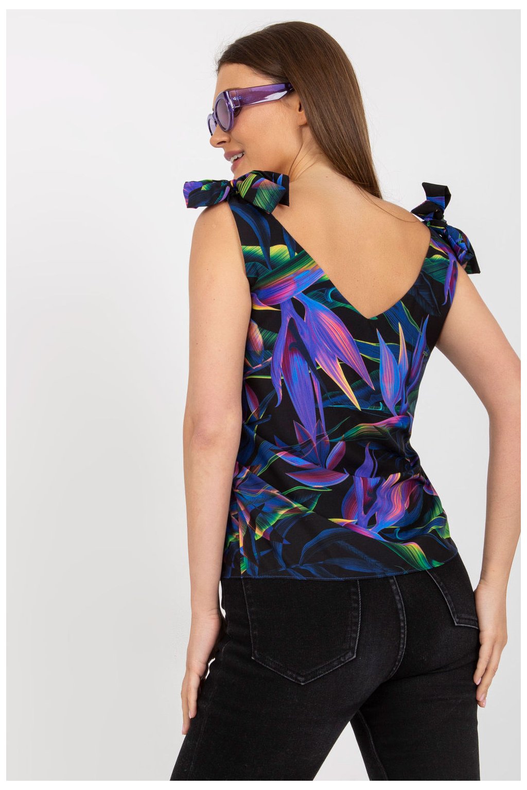 Rovně střižený top s výstřihem do V. Ramínka horní části s ozdobnými vazbami. Skvěle se hodí pro mnoho příležitostí.