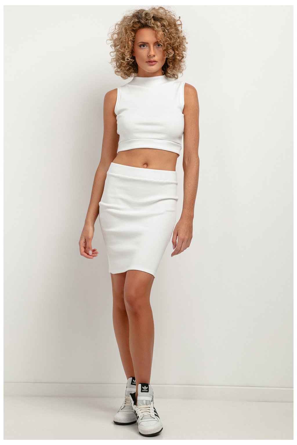 Krátký vypasovaný top s malým roláčkem ušitý z měkké žebrované látky dokonale kombinuje pohodlí s módou. Kromě malého roláku má top také žebrovaný lem a střih bez rukávů se zkrácenou délkou, která končí nad pupíkem. Látka je elastická.