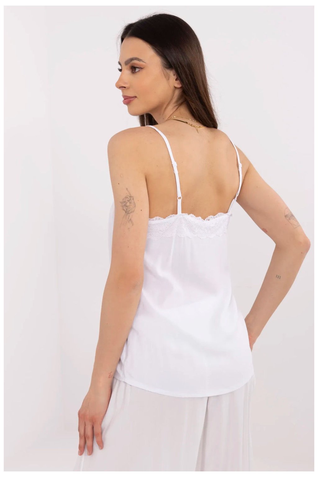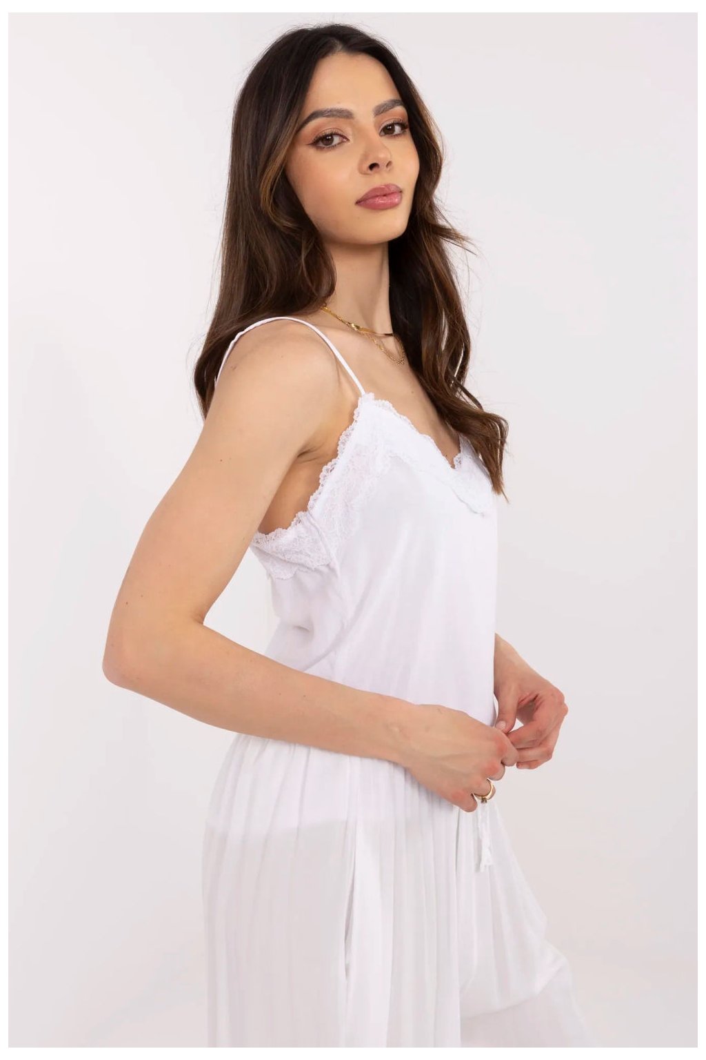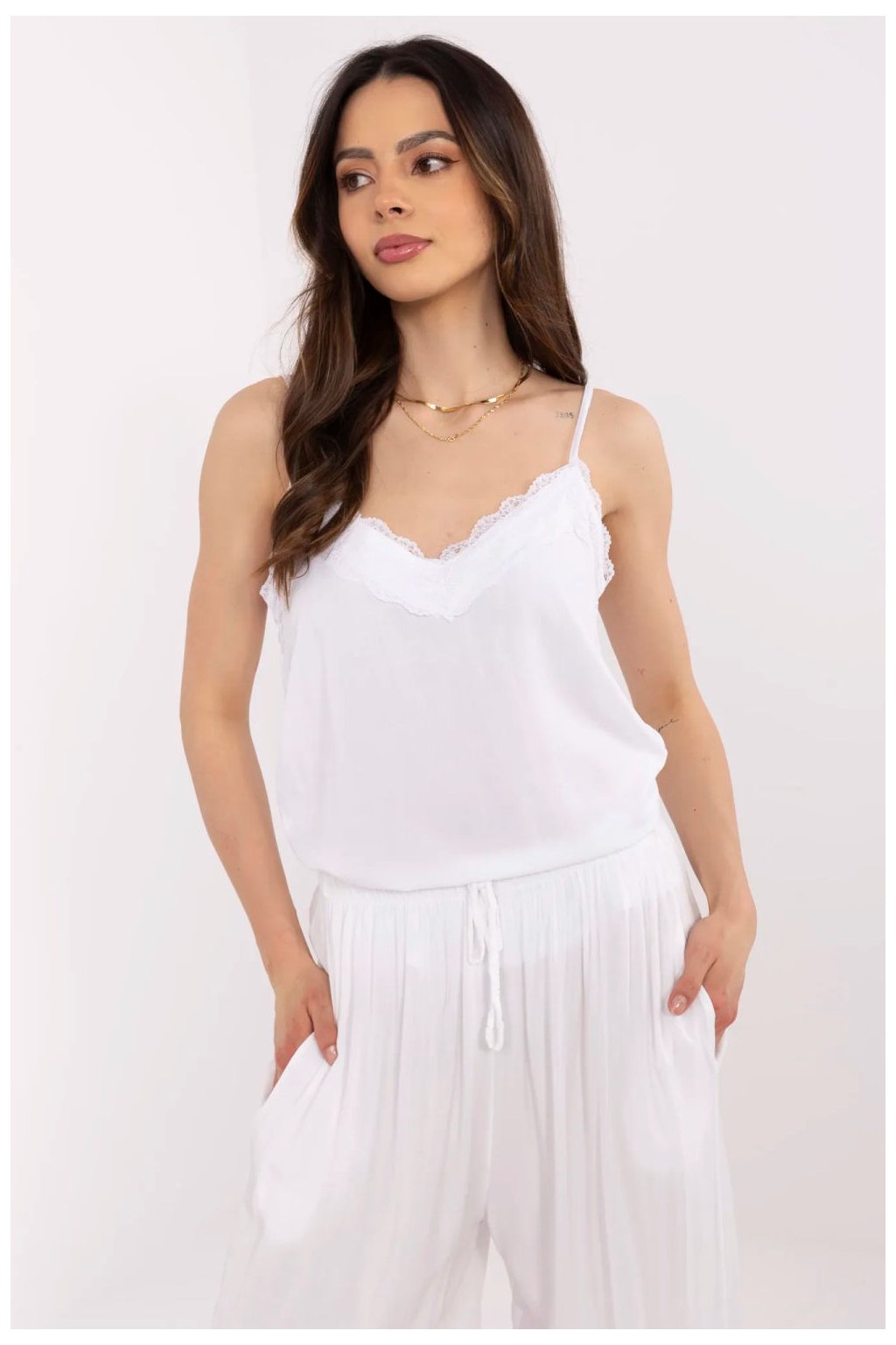 Elegantní dámské triko ve stylu casual je ideální volbou na letní dny nebo jako základ pro lehké přehozy a saka. Vyrobeno z převládající viskózy, je mimořádně měkké, prodyšné a šetrné k pokožce. Model patří do řady ekologického oblečení, což je uvědomělý výběr pro ženy, které ocení módu v souladu se životním prostředím. Triko má hladký, jednotný vzor, který mu dodává univerzální charakter. Standardní délka se skvěle hodí jak k džínům, tak k sukním. Nastavitelné ramínka umožňují ideální přizpůsobení délky a zajišťují maximální pohodlí při nošení. Jemný výstřih ve tvaru srdíčka je zdobený krajkou, která triku dodává jemný, ženský šarm. Jedná se o nadčasový model, který se osvědčí v mnoha každodenních stylizacích, od volných po elegantnější.