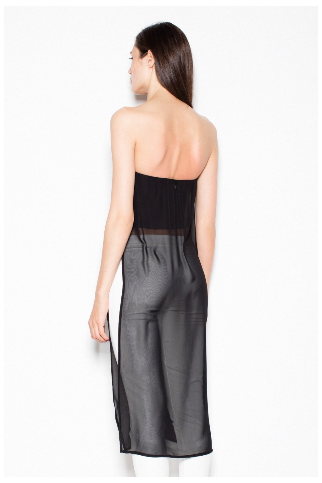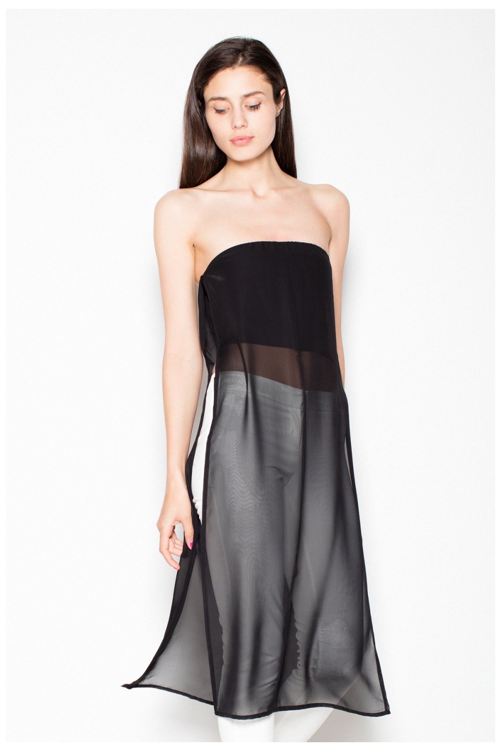 Extravagantní top bez ramínek prodloužený ozdobným šifonem. Po stranách má vroubky. Model originálního střihu, vypadá skvěle s přiléhavými legínami.