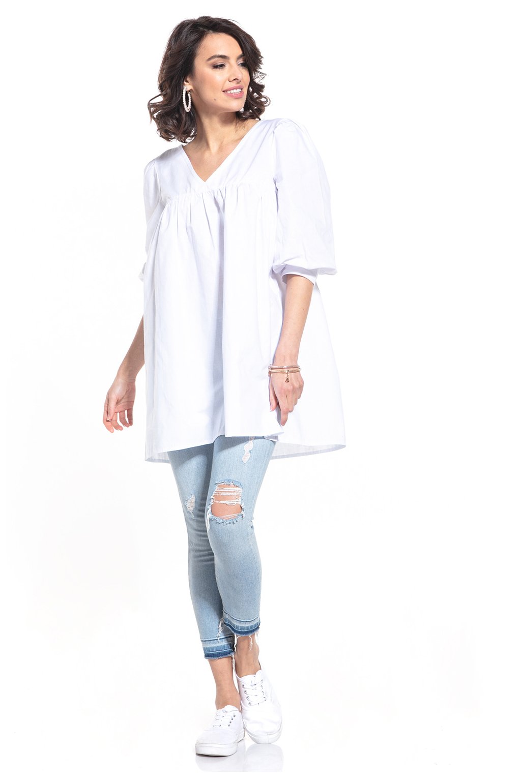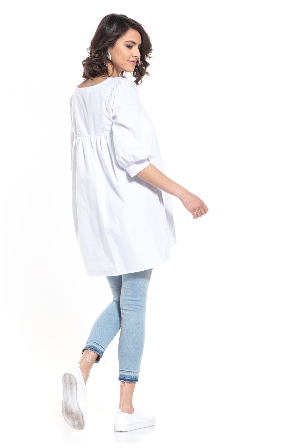 Tunika se špičatým výstřihem, mírným řasením v oblasti hrudníku a bufetovými rukávy ve 3/4 délce zakončenými manžetou.