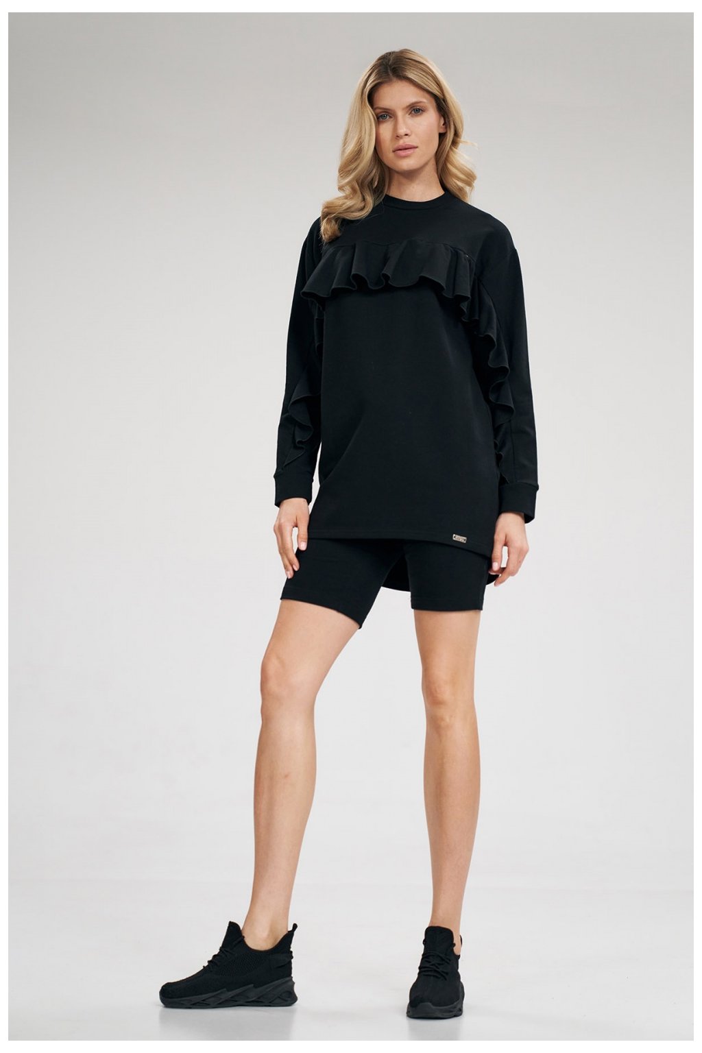 Jednoduchá bavlněná tunika s dlouhým rukávem zdobená volánkem, který přechází přes linii prsou. Výstřih. Delší, půlkruhová záda.