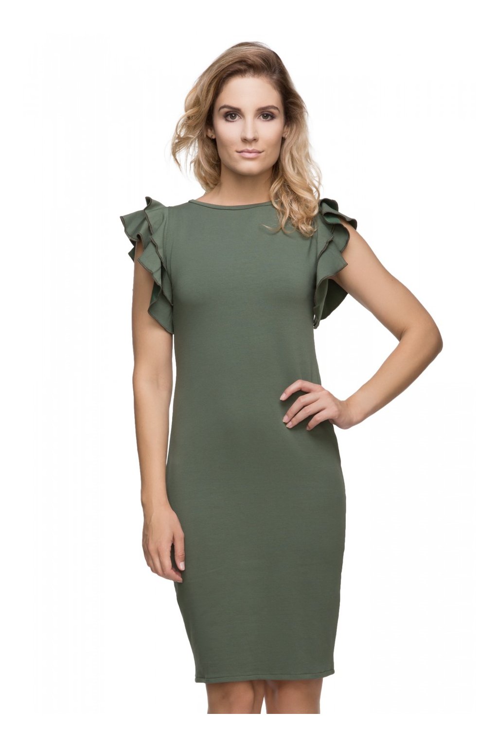Šaty z pleteniny. Výstřih zakončený lemem. Působivý volán místo tradičních rukávů.