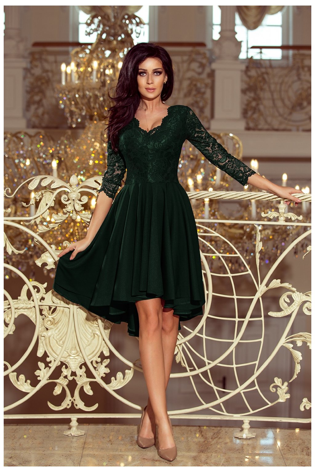 Asymetrické tmavě zelené exkluzivní šaty Nicolle s delšími zády, 3/4 rukávy, výstřihem a krajkou. Sukně s delším zadním dílem bude ideální pro tanec. Vyrobeno v Polsku.