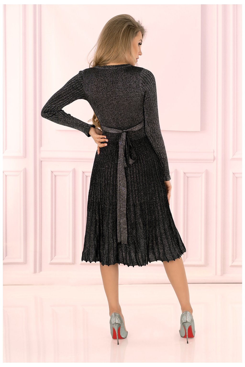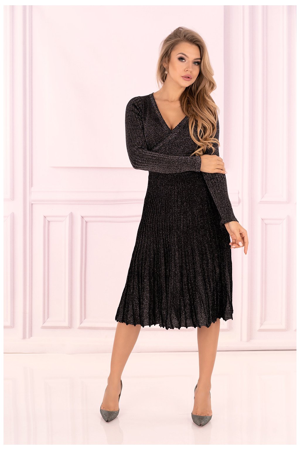 Jedny z nejmódnějších šatů současnosti. Vyrobeno z měkkého, pružného úpletu (na bázi bavlny), do kterého je vetkána krásná stříbrná nit. Sexy a velmi ženská. Délka ke kolenům, mírně nařasená spodní část a dlouhé rukávy. Lákavý překrývající se výstřih. Horní díl mírně vypasovaný, spodní díl vzdušný. Šaty se vzadu zavazují, takže si je můžete přizpůsobit své postavě.