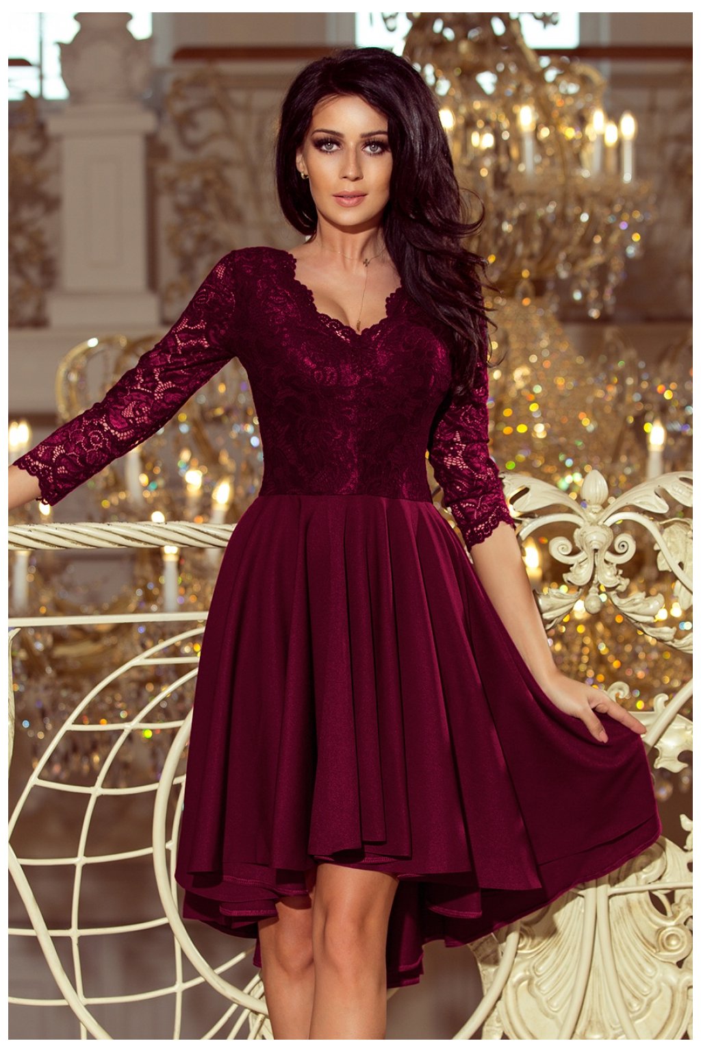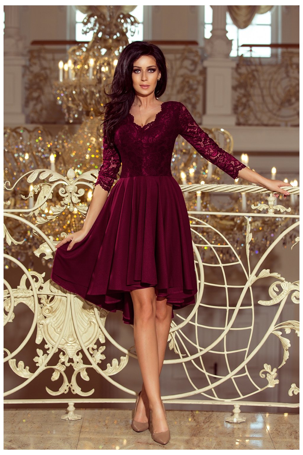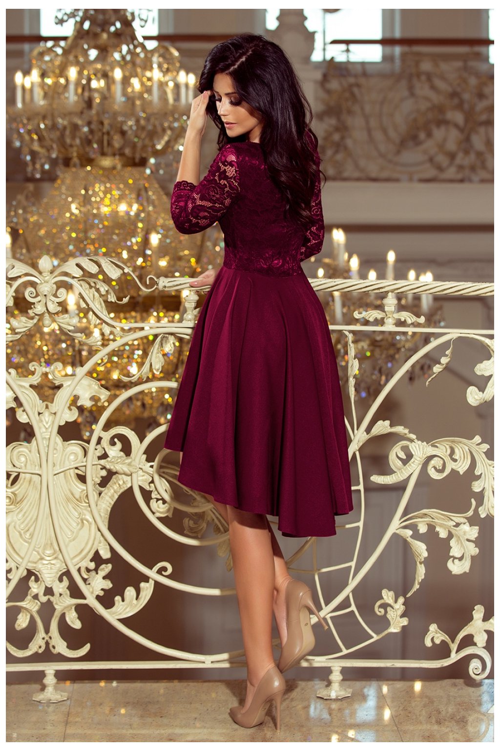Asymetrické exkluzivní šaty s delšími zády, 3/4 rukávy, výstřihem a krajkou ve švestkové barvě. Sukně s delším zadním dílem bude ideální pro tanec. Vyrobeno v Polsku. Značka Numoco.