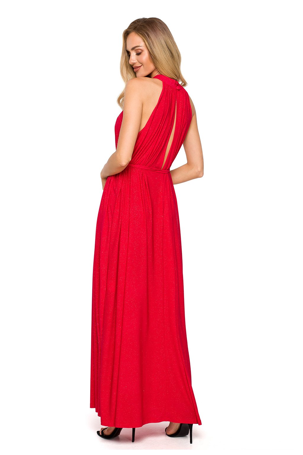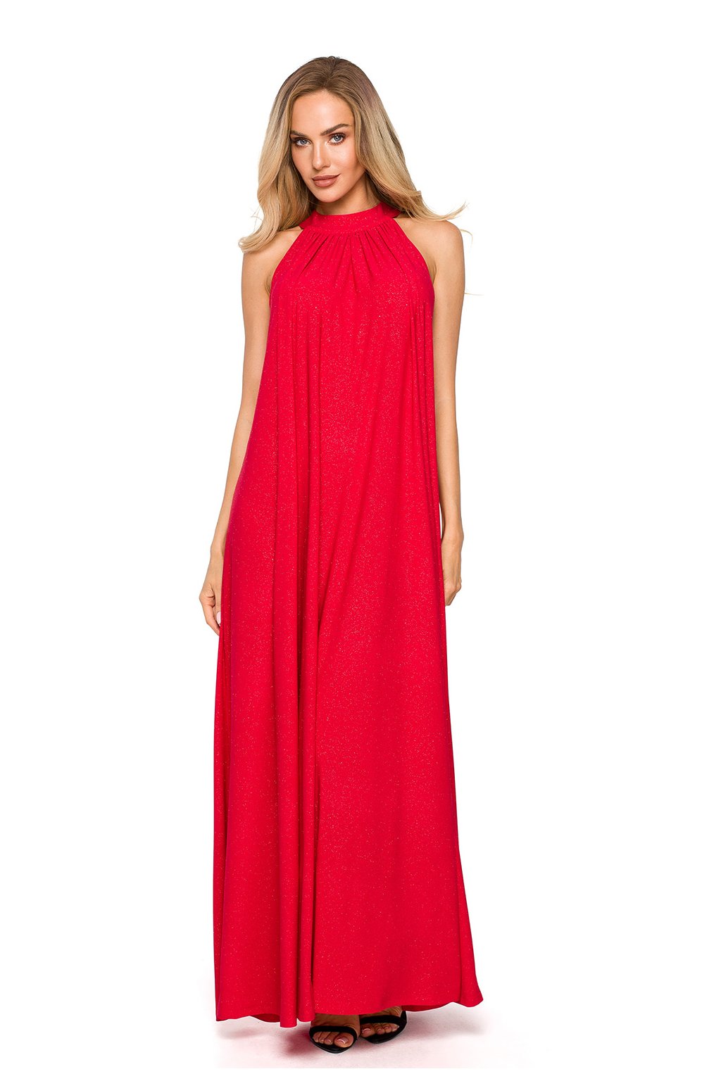 Jedny šaty a několik možností stylingu. Rozšířený maxi střih s výstřihem na ramínka je osvědčeným řešením pro dámy, které si cení volnosti nebo chtějí zakrýt nedostatky postavy. Šaty jsou vyrobeny z látky s brokátem, bez podšívky. S páskem na zavazování.