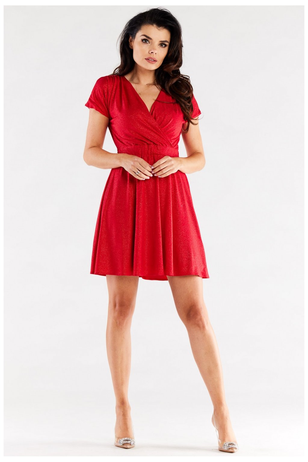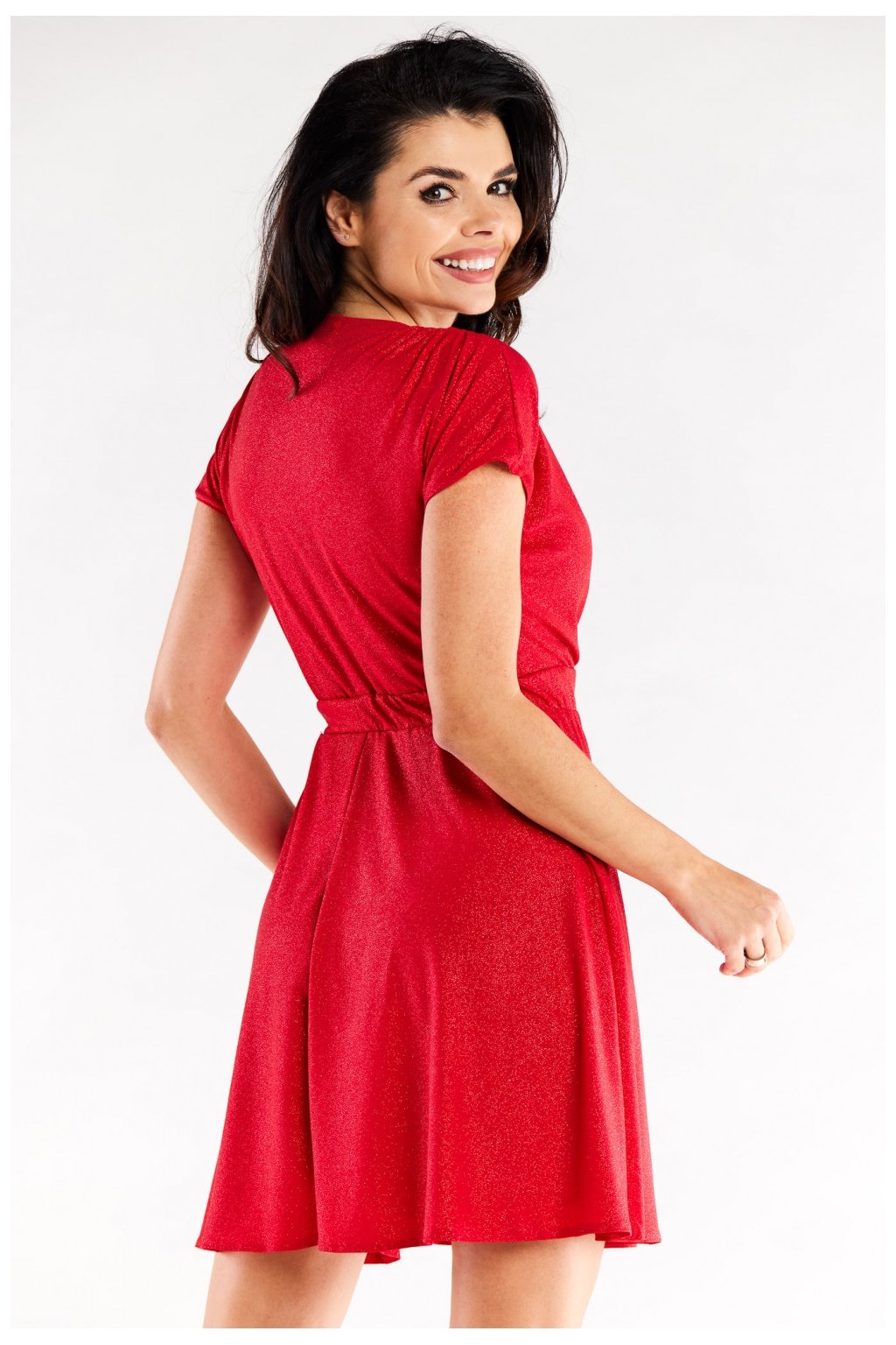 Krátké rozšířené šaty s obálkovým vrškem a krátkými rukávy. Ramena ozdobně řasená. V pase je nařasený široký elastický pás, který se přizpůsobí postavě. Šaty jsou ušité na elastické podšívce. Šaty vyrobené v Polsku.