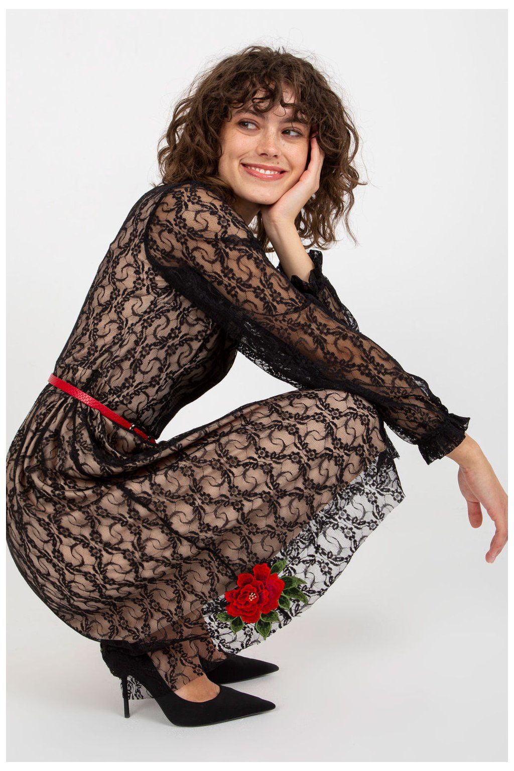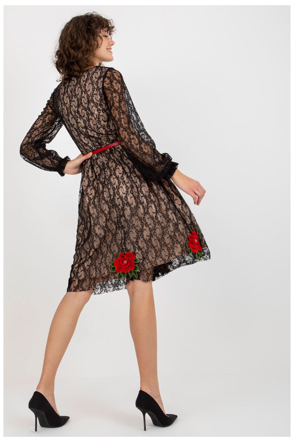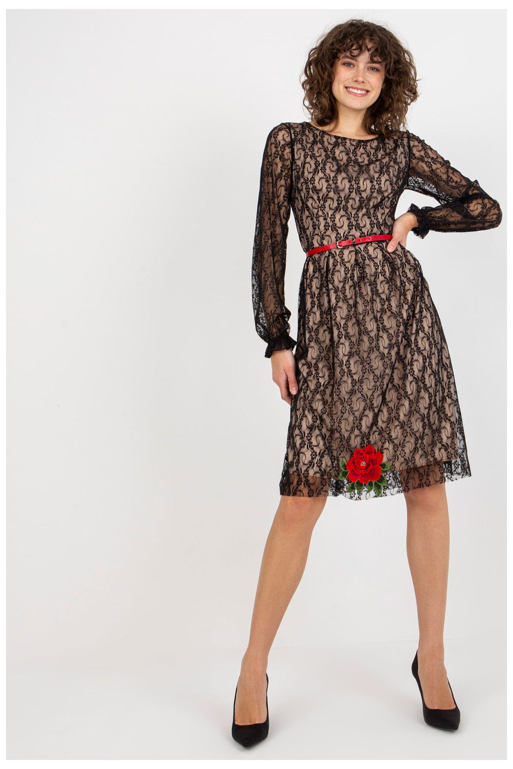 Krajkové šaty s dlouhými rukávy a podšívkou. Šaty se zapínají na krytý zip a v pase mají pásek. Šaty zdobené našitými květinami.