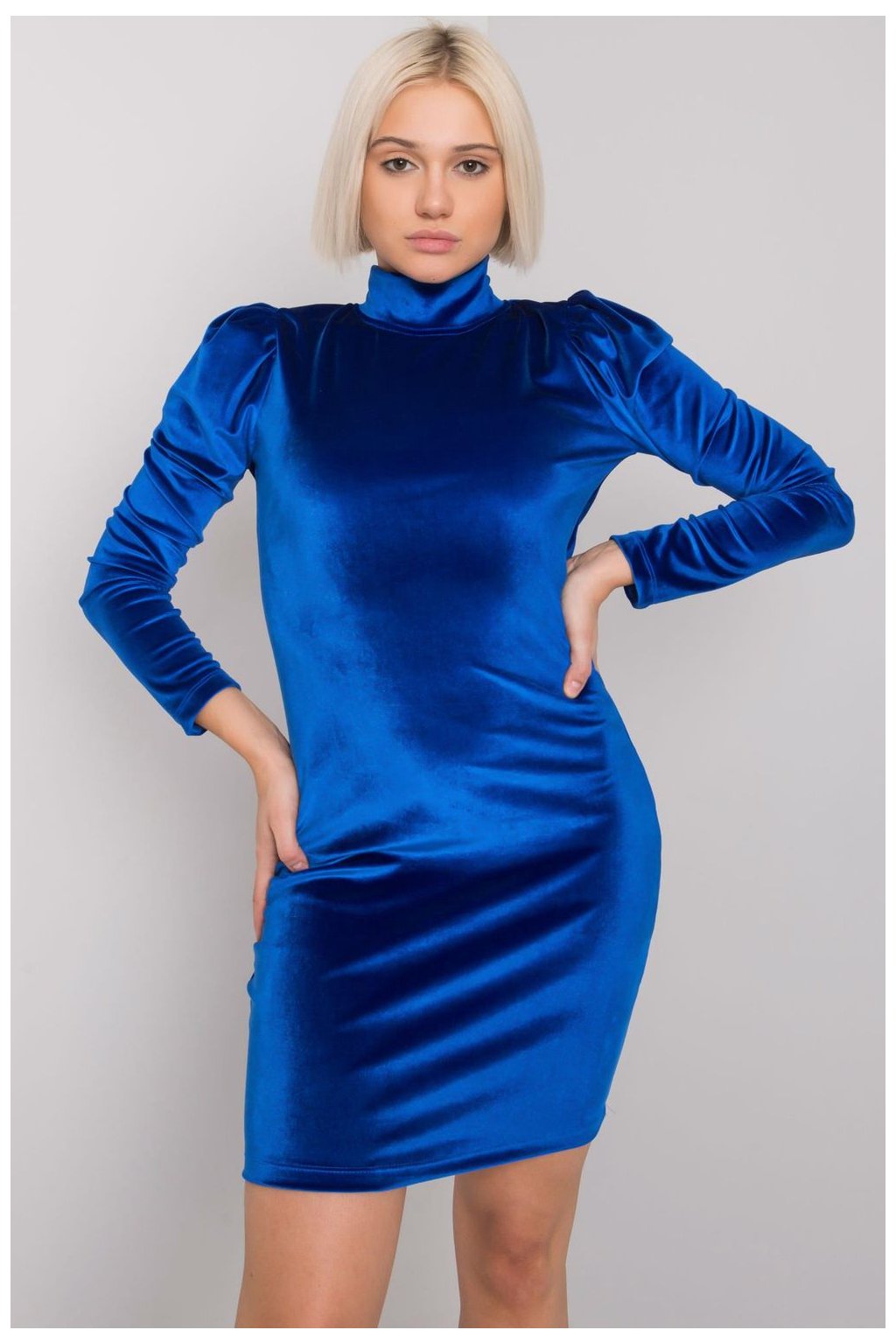 Kobaltové velurové šaty s vypasovaným střihem a zapínáním na zip. Šaty s dlouhými rukávy a bufetem. Skvěle se hodí pro mnoho příležitostí.