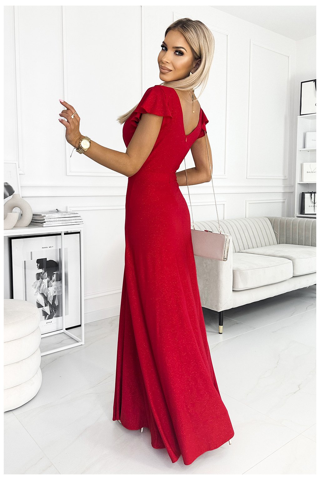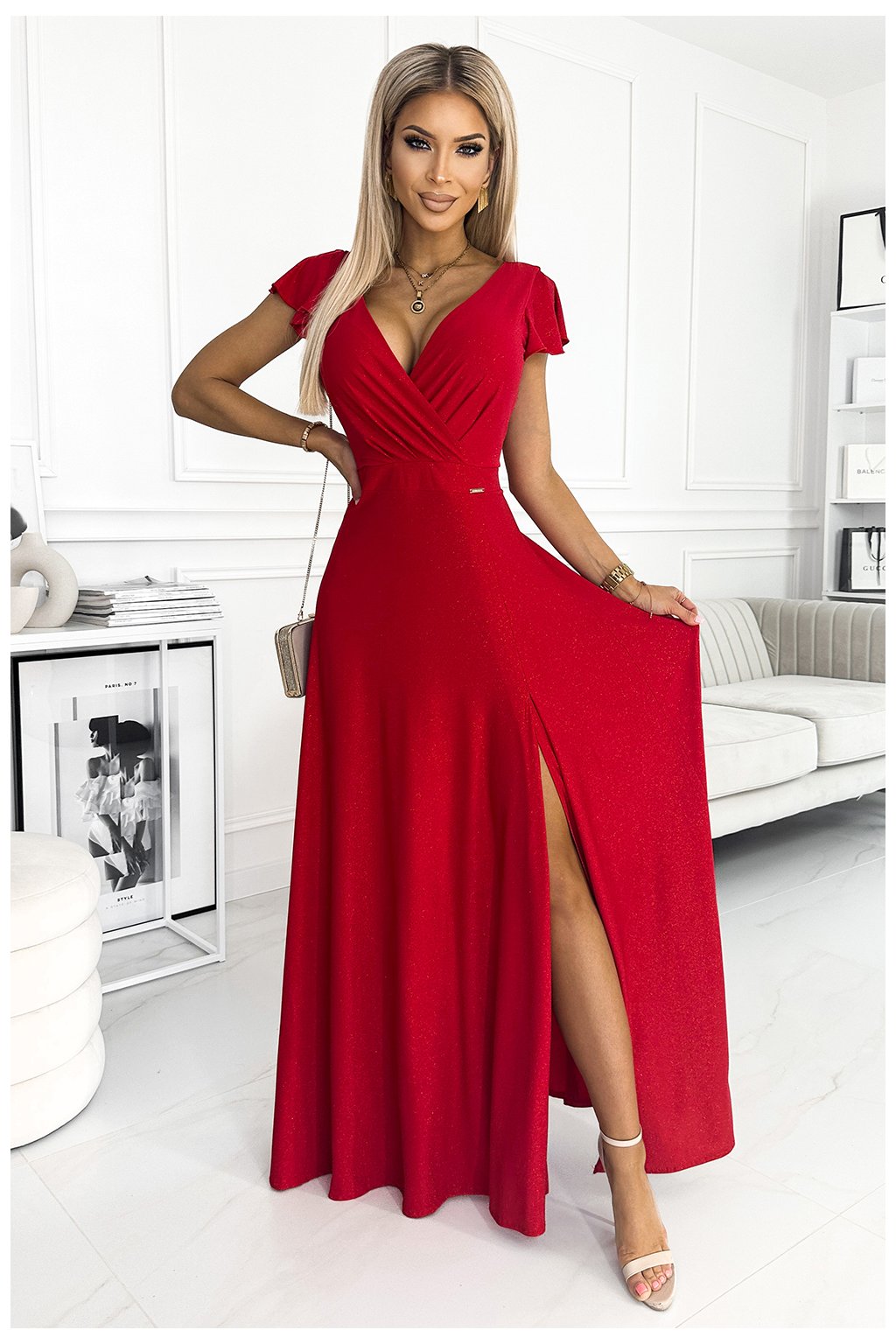 Dlouhé třpytivé maxi šaty s obálkovým výstřihem a rozparkem na nohou. Šaty v červené barvě se třpytkami. Šaty krásně odhalují výstřih a jsou skvělé na tanec. Zapínají se na zádech na krytý zip. Polský výrobek. Značka numoco.