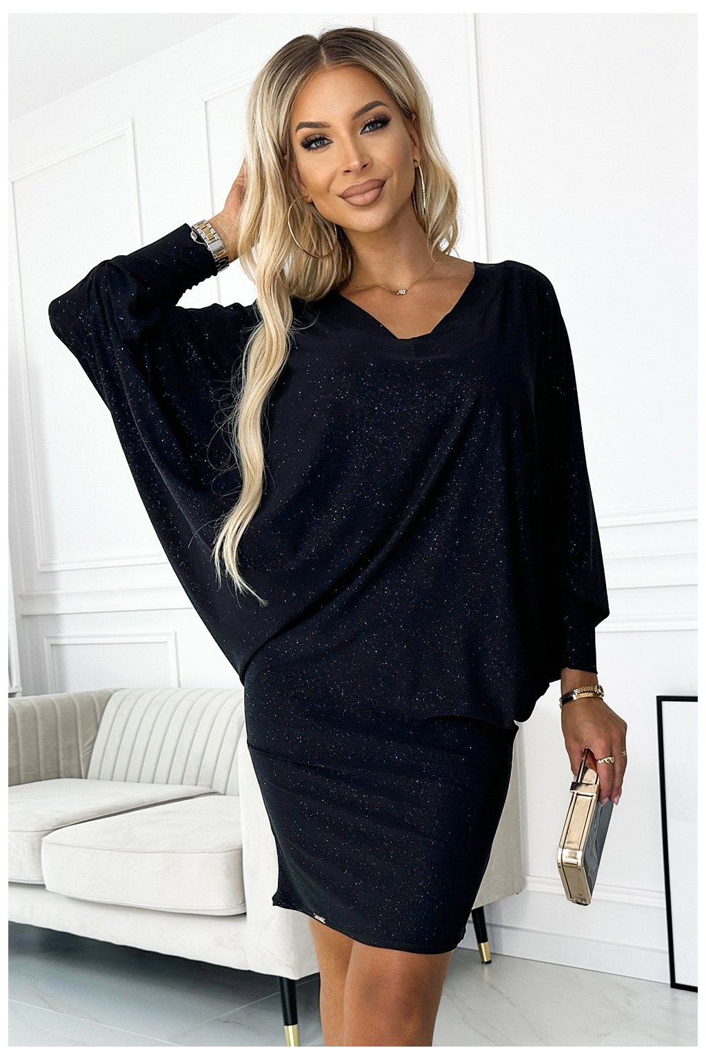 Netopýří šaty s výstřihem. Vyrobeno z elastické látky se třpytkami. Lze nosit rovně nebo volně. Šaty v černé barvě s brokátem. Značka numoco. Polská výroba.