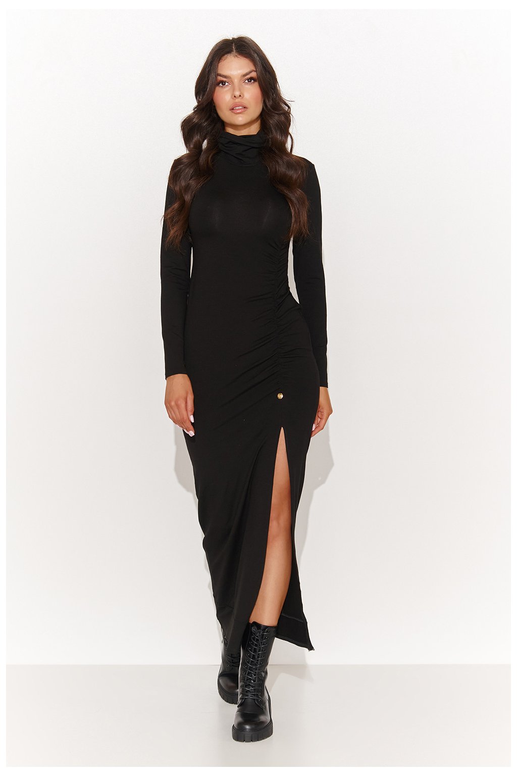Dlouhé šaty ušité z elastického viskózového úpletu jsou mimořádně pohodlné a elegantní. Šaty mají dlouhé rukávy a praktický rolák, takže jsou ideální pro mnoho příležitostí. Jedná se o maxi šaty se sexy rozparkem, který je navíc zdoben půvabnou zlatou destičkou, což jim dodává jemnou extravaganci. Tato kreace dokonale zvýrazňuje ženskou postavu a zároveň poskytuje pohodlí díky elastickému viskózovému úpletu. K dostání je pouze v černé barvě. Je spolehlivou volbou pro elegantní vycházky. Klasický střih umožňuje šaty použít v mnoha zajímavých stylizacích.
