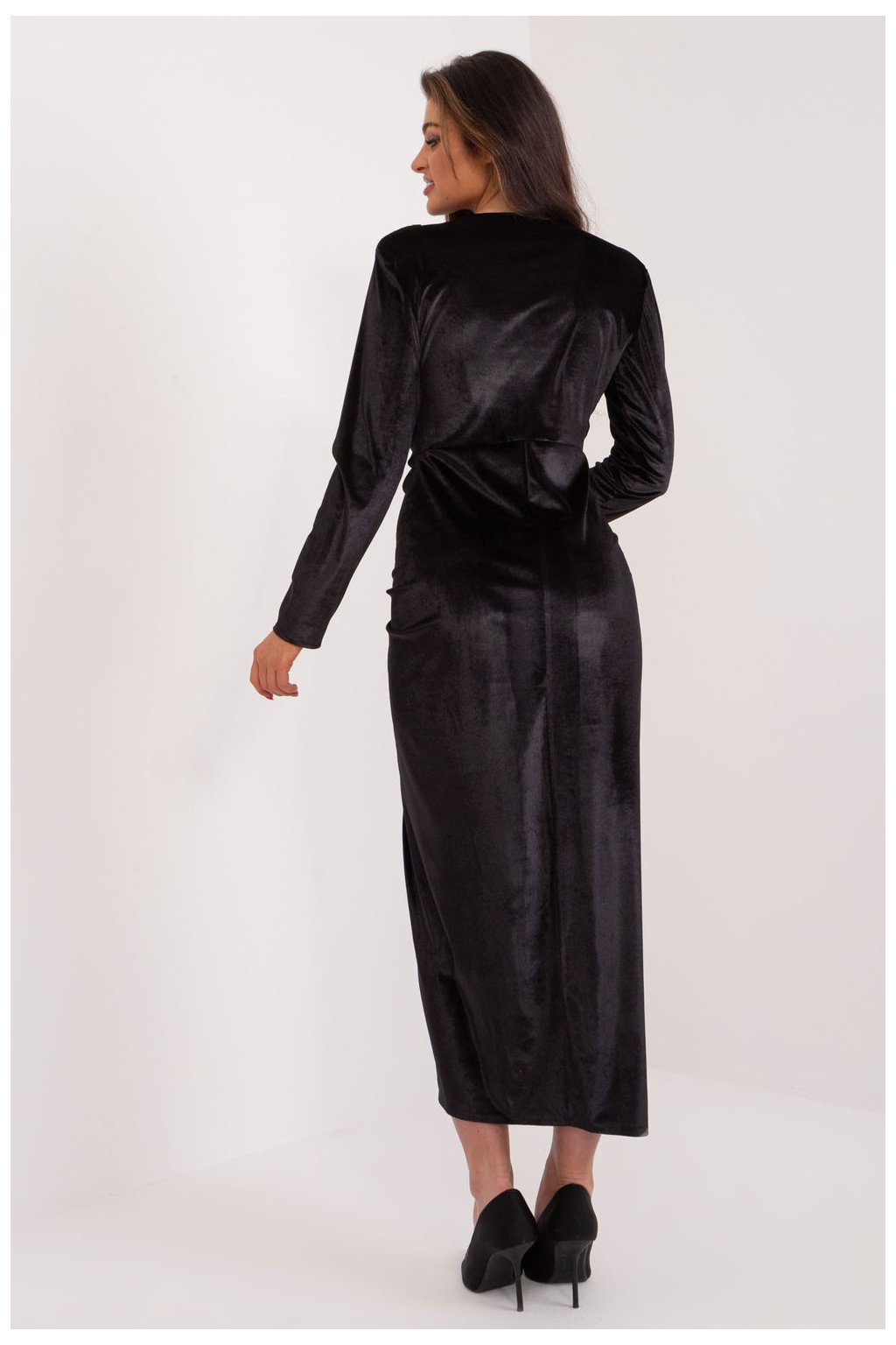 Večerní velurové šaty jsou výrazem luxusu a elegance, ideální pro zvláštní příležitosti. Jejich střih je jednoduchý, což jim dodává nadčasový charakter, ideální pro formální vycházky i večírky. Originálním prvkem šatů jsou ramenní vycpávky, které dodávají šatům trochu extravagance a charakteru. Ozdobné květy umístěné na přední straně a odnímatelné jsou jemným akcentem, který lze přizpůsobit, což umožňuje měnit vzhled šatů v závislosti na příležitosti. Přední část šatů zdobí rozparek, který se táhne od kolen dolů a dodává jim jemnou smyslnost. Velurový materiál, hladký na dotek a hedvábný, vyrobený z vysoce kvalitní bavlny, dodává šatům eleganci a jedinečný šmrnc. Šaty mají dlouhé rukávy, takže jsou ideální pro chladnější večery. Hluboký výstřih zvýrazňuje krk a dodává mu výraz, přičemž zůstává stylovým akcentem. Midi délka šatů je dokonalým kompromisem mezi elegancí a volností pohybu. Absence zapínání usnadňuje oblékání a přítomnost podšívky přispívá k pohodlí nositelky. Tyto velurové společenské šaty jsou určeny pro ženy, které chtějí zaujmout svým vzhledem pro zvláštní příležitosti a zároveň vyzařovat jemnou eleganci a styl.