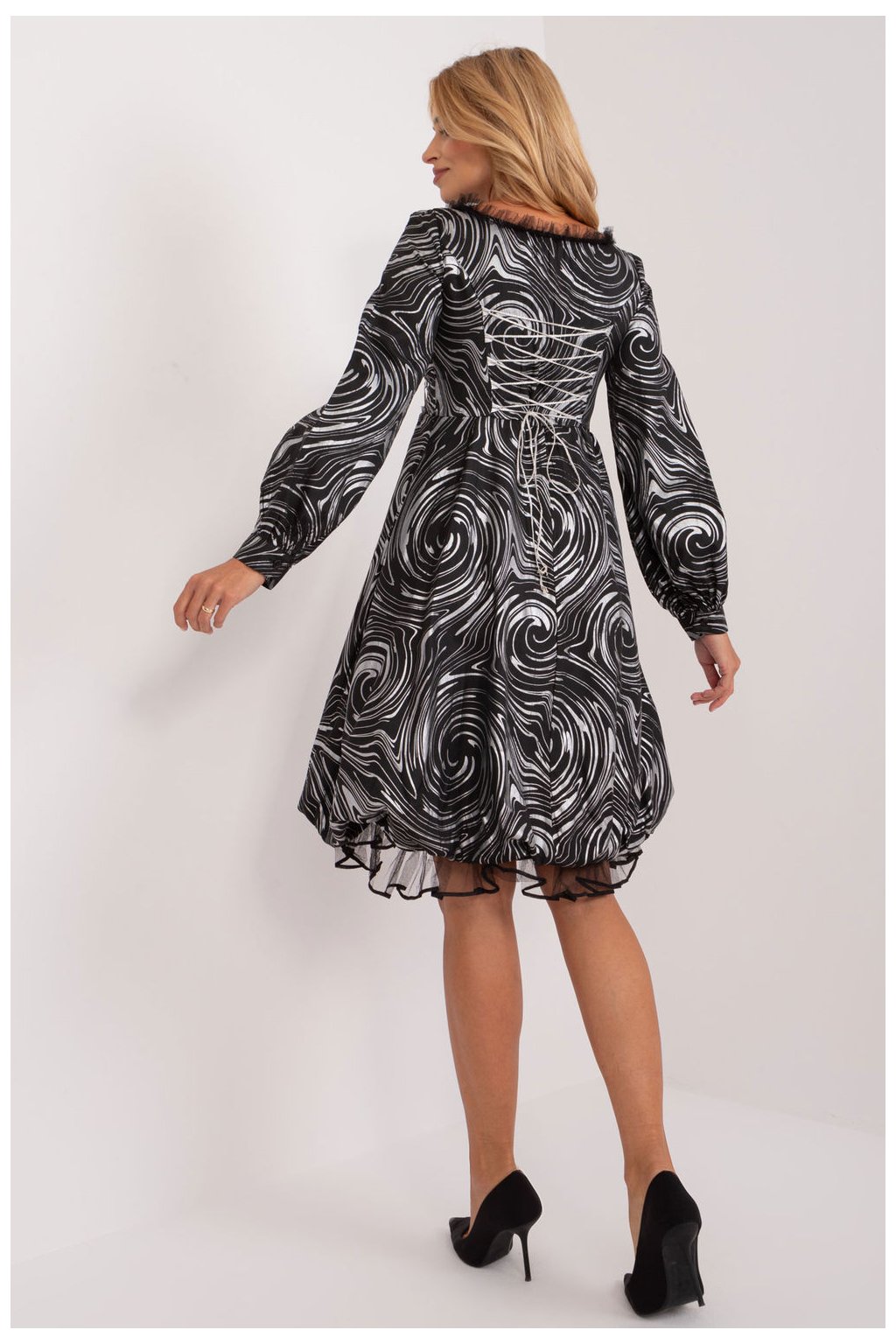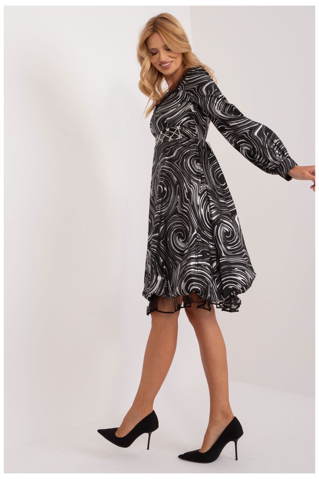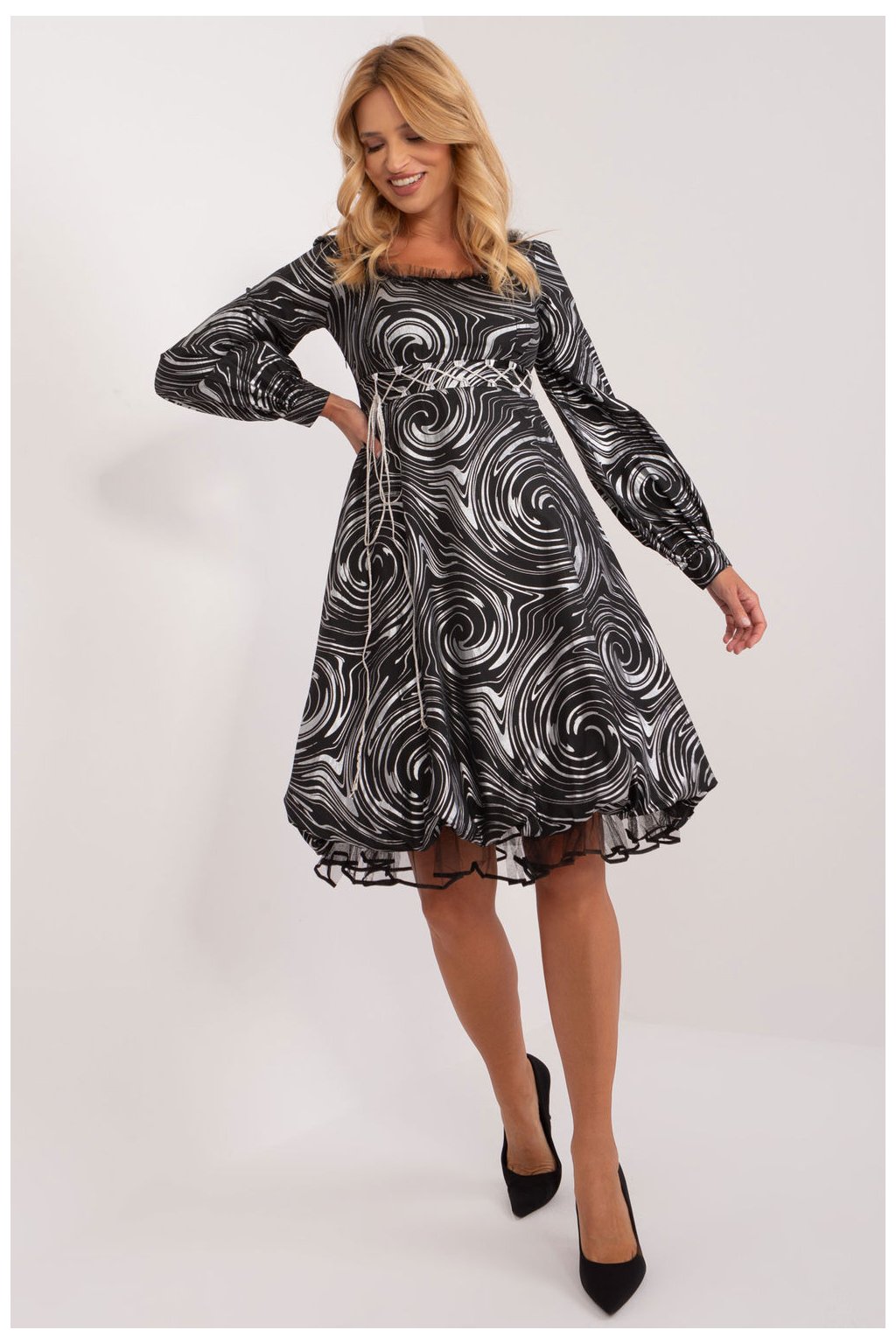 Večerní šaty, které jsou výrazem luxusu a elegance, jsou ideální pro zvláštní příležitosti, jako jsou elegantní večírky, slavnostní vycházky nebo události. Jejich rozšířený střih dodává lehkost a ženský půvab a vytváří nápadný styling. Použitý zajímavý potisk dodává šatům individuální charakter a přispívá k jejich jedinečnému výrazu. Šaty jsou vyrobeny z vysoce kvalitního polyesteru a zaručují nejen okouzlující vzhled, ale také pohodlné nošení. Díky délce pod kolena jsou šaty ideální pro večerní vycházky a zároveň umožňují jemně zvýraznit nohy. Dlouhý bufetový rukáv dodává šatům eleganci a jedinečný styl a zároveň umožňuje přizpůsobit se různým povětrnostním podmínkám. Kulatý výstřih je univerzální a nadčasový, zatímco zapínání na zip umožňuje šaty snadno oblékat a svlékat. Ozdobné vázání v pase a na zádech zvýrazňuje pas a dodává šatům jemný nádech. Podšívka zaručuje další pohodlí a celek vytváří harmonický obraz večerní elegance. Tyto večerní šaty jsou ideální volbou pro ženy, které chtějí zaujmout svým vzhledem na výjimečných událostech a zároveň zdůraznit svou individualitu.