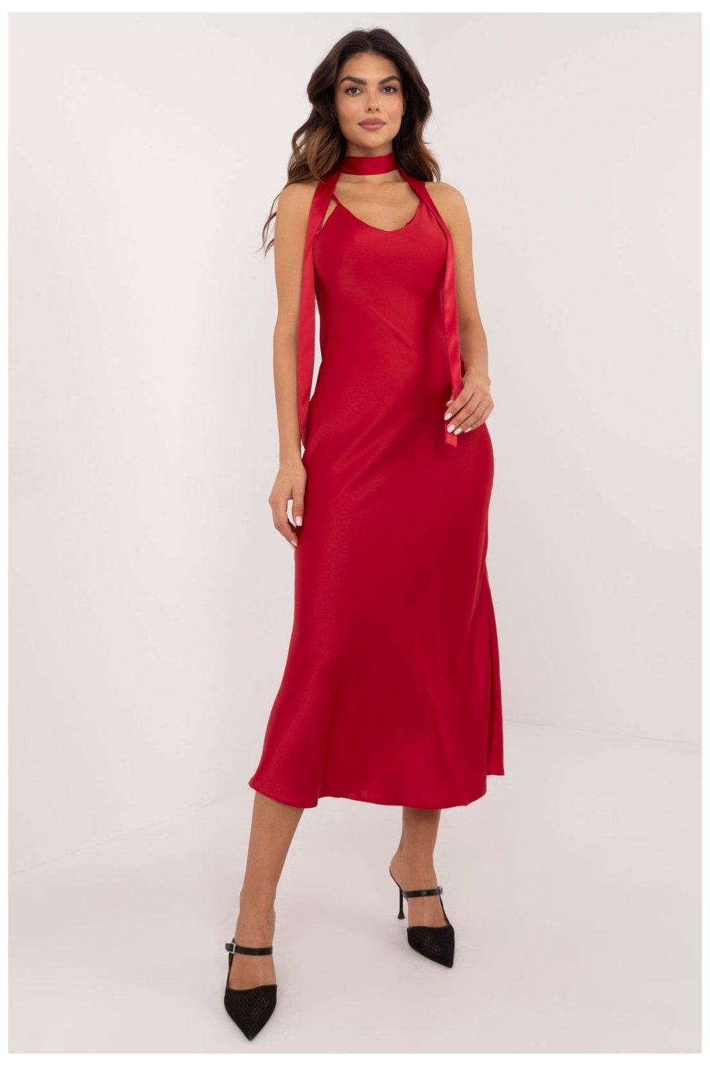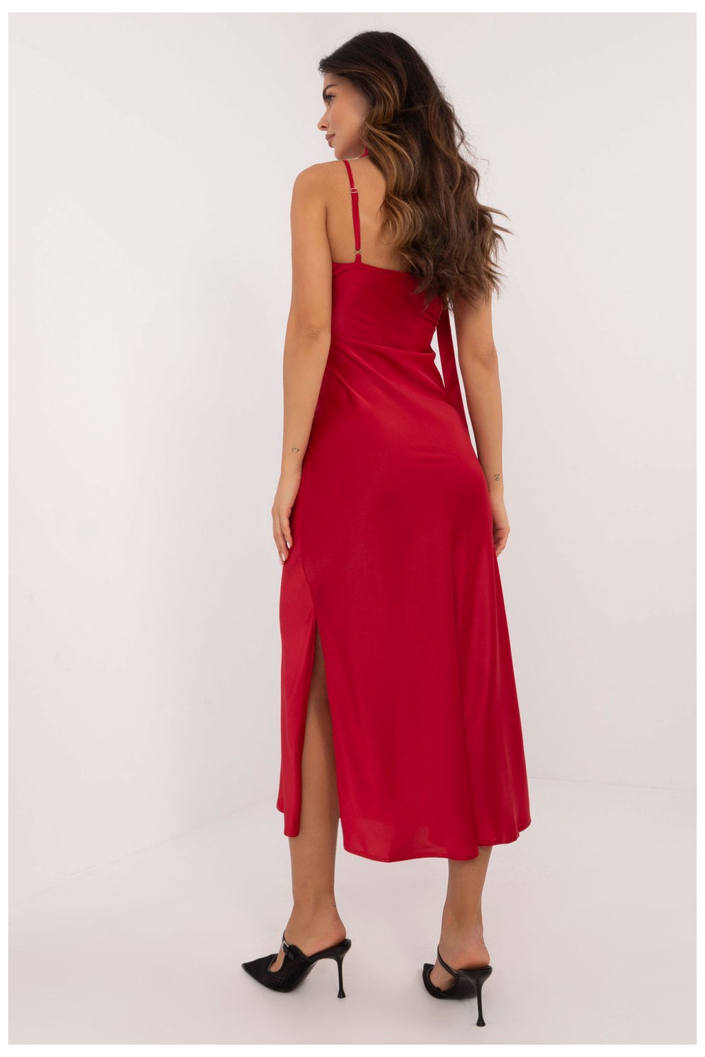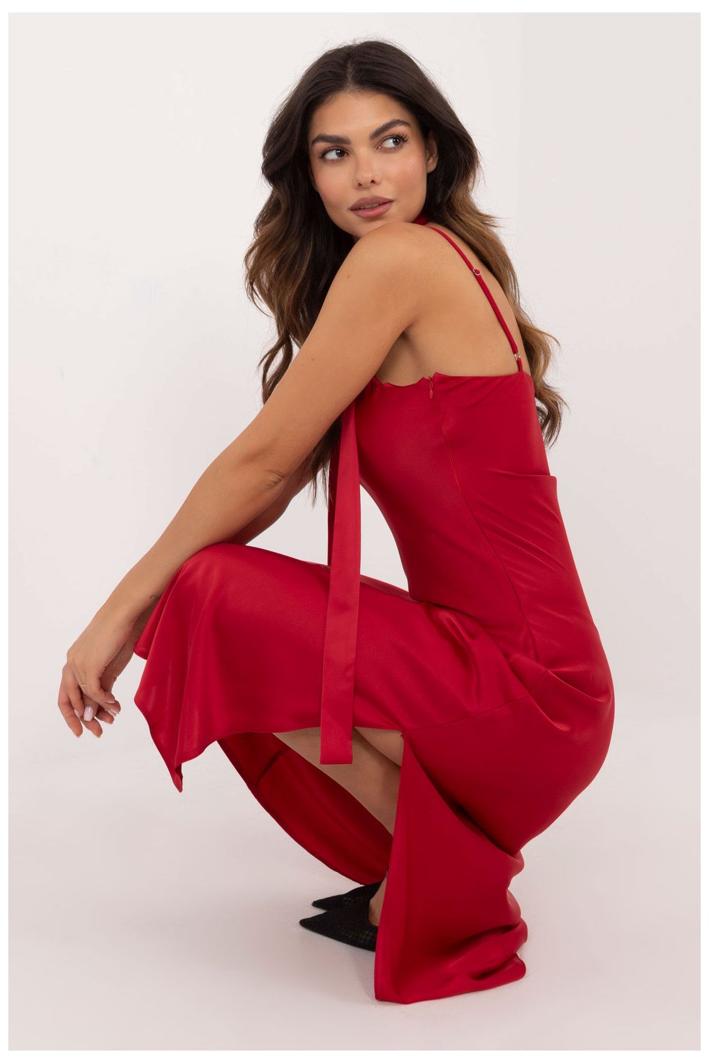 Elegantní večerní šaty ve střihu mořské panny jsou výjimečnou volbou pro zvláštní příležitosti. Jsou vyrobeny z převažující kombinace viskózy a polyesteru, poskytují pohodlí a jemný lesk, což podtrhuje elegantní charakter této kreace. Střih šatů je rozšířený, což dodává lehkost a volnost a zároveň zdůrazňuje ženskou siluetu. Délka šatů sahá do poloviny lýtek, což jim dodává jemnou eleganci, ideální na formální schůzky nebo večerní večírky. Šaty jsou bez ramínek a mají hluboký výstřih do V, takže krásně odhalují dekolt a ramena. Šaty mají na boku praktické zapínání na zip, které usnadňuje jejich oblékání. Mezi další prvky patří podšívka pro větší pohodlí a pásek na zavazování v pase pro lepší přizpůsobení. Díky hladkému vzoru a sofistikované jednoduchosti jsou tyto šaty ideální volbou pro elegantní vycházky.
