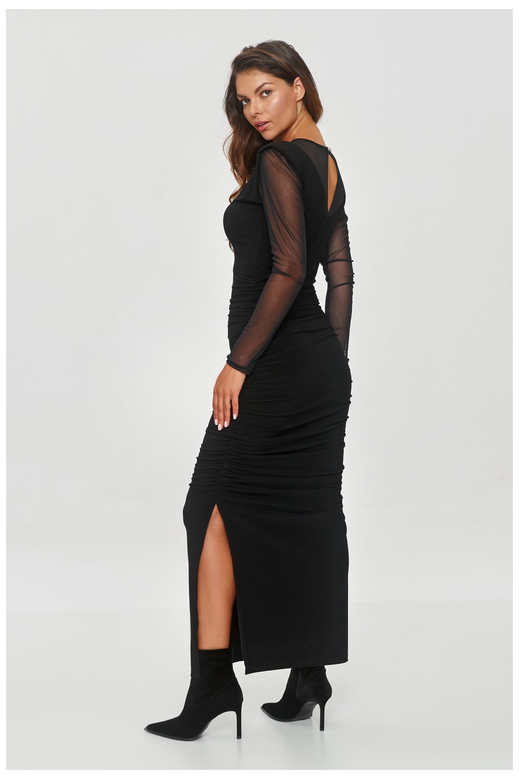 Nestručná černá šaty, které vyzařují eleganci a jemnost. Model má přiléhavý střih, který podtrhuje postavu. Žebra na bocích dodávají strukturu a zdůrazňují pas a boky, zároveň maskují nedokonalosti postavy. Šaty mají dlouhé průhledné rukávy zítřka, které vytvářejí jemný kontrast s neprůhledným tělem šatů, přispívající k jejich elegantnímu a modernímu vzhledu. Výstřih je kombinací průhledné látky a výstřihu ve tvaru písmene V, který přidává návrhu smyslný charakter. Navíc na ramenou jsou umístěny efektní polštářky, zdůrazňující linii ramen. Elegantním doplňkem je pozlacený knoflík umístěný na zádech šatů, který usnadňuje volné oblékání kreace. Šaty sahají až po kotníky a mají koketní rozpark, umožňující volnost pohybu a přidávající jemný půvab. Model je ideální na formální příležitosti nebo večerní vycházky, vyvažuje eleganci s nádechem drzosti.