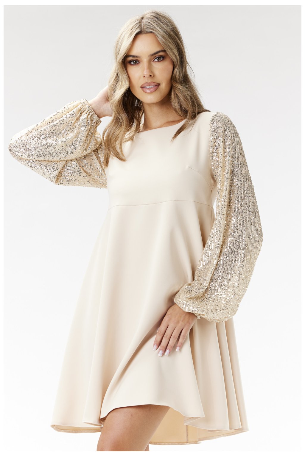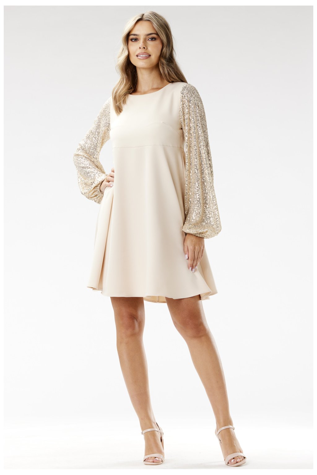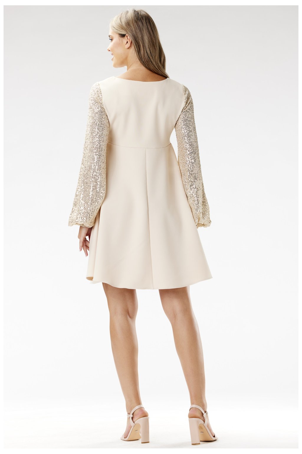 Šaty ve tvaru trapezu mini s flitrovými rukávy Elegantní šaty ve tvaru trapezu mini s flitrovými rukávy od polské značky Awama. Ideální na speciální příležitosti, jako jsou rande, divadelní vystoupení nebo svátky. Trapezový střih jemně skrývá postavu, poskytujíc lehkost a pohodlí při nošení. Flitrové rukávy přidávají lesk a přitahují pohledy. Polozaoblený výstřih elegantně zdůrazňuje krk, přidávaje ženský šarm. Šaty se zapínají na skrytý zip, což zaručuje ideální přizpůsobení postavě. Must-have na každou elegantní příležitost!