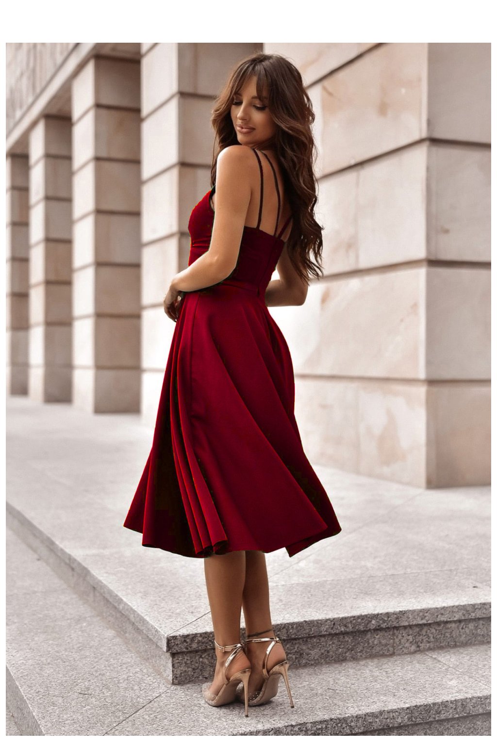 Šaty s délkou 7/8 na ramínkách, s hlubokým přesahem dekoltu, seříznuté pod prsy. Spodní část rozkročená. Ideální návrh na mnoho příležitostí.