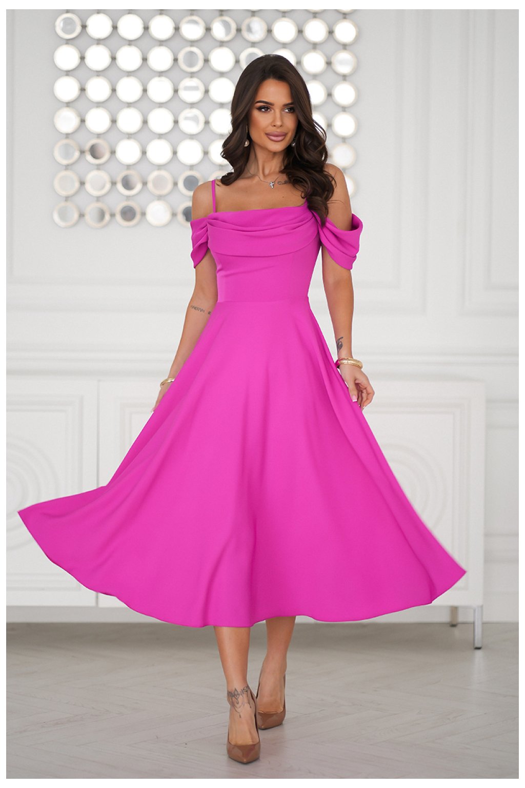 Elegantní midi šaty v biskupské barvě. Drapovaný vrch s padajícími rukávy a tenkými ramínky zdůrazňuje ženský styl, zatímco rozkročený spodek přidává lehkost. Šaty se zapínají na skrytý zip.