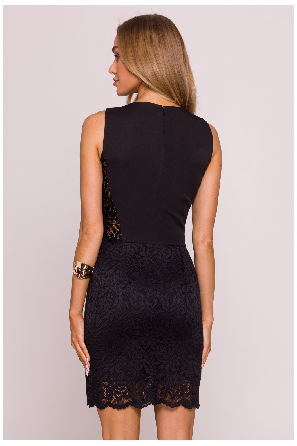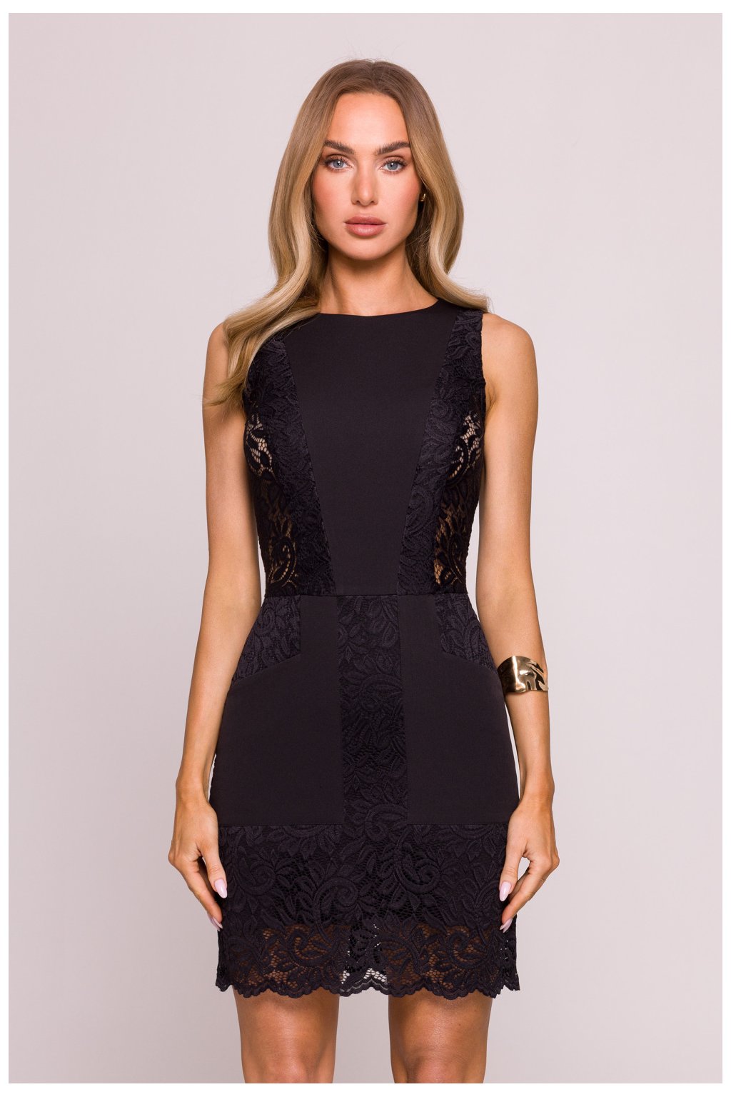 Rafinované šaty s přiléhavým střihem, které zdůrazňují postavu a kombinují klasiku s moderním akcentem. Vyrobena z hladké, příjemné na dotek látky, doplněná krajkovými vložkami po stranách a dole, které nejen dodávají eleganci, ale také opticky tvarují pas a zeštíhlují postavu. Zakrytý, kulatý výstřih a absence rukávů dávají celku minimalistický charakter, a olověný střih sahající před koleno se skvěle hodí na oficiální příležitosti a večerní výstupy. Šaty se zapínají vzadu na diskrétní, zakrytý zip, což zajišťuje pohodlí nošení a estetické dokončení. Navrženo a vyrobeno v Polsku s důrazem na každý detail. Krajková část 90% nylon, 10% spandex.