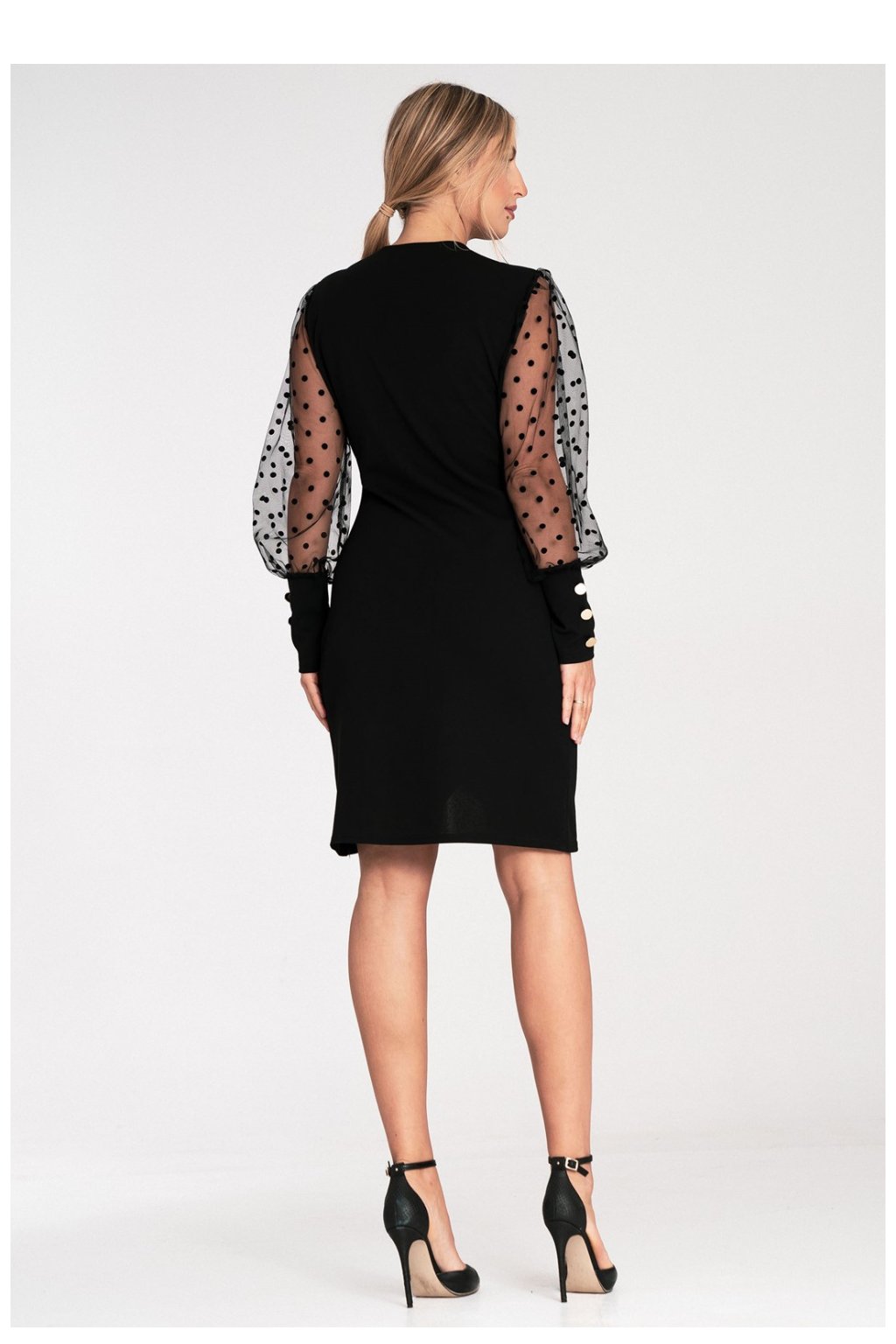Šaty s efektními puntíky rukávy. Na přední straně a na manžetách ozdobné zlaté knoflíčky.