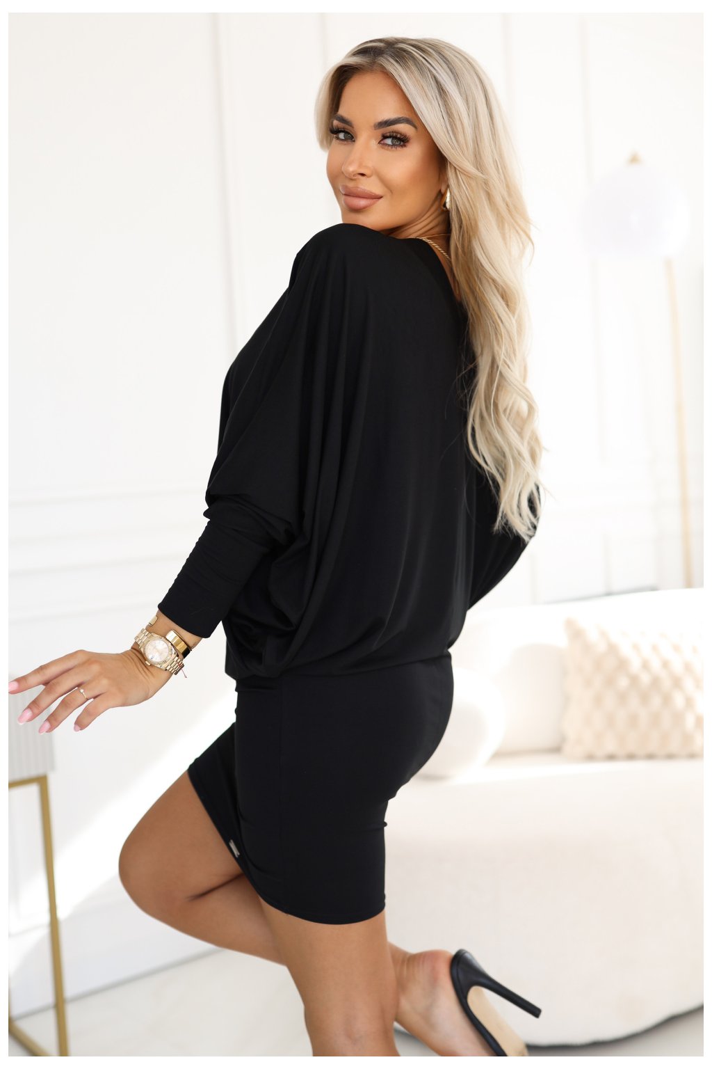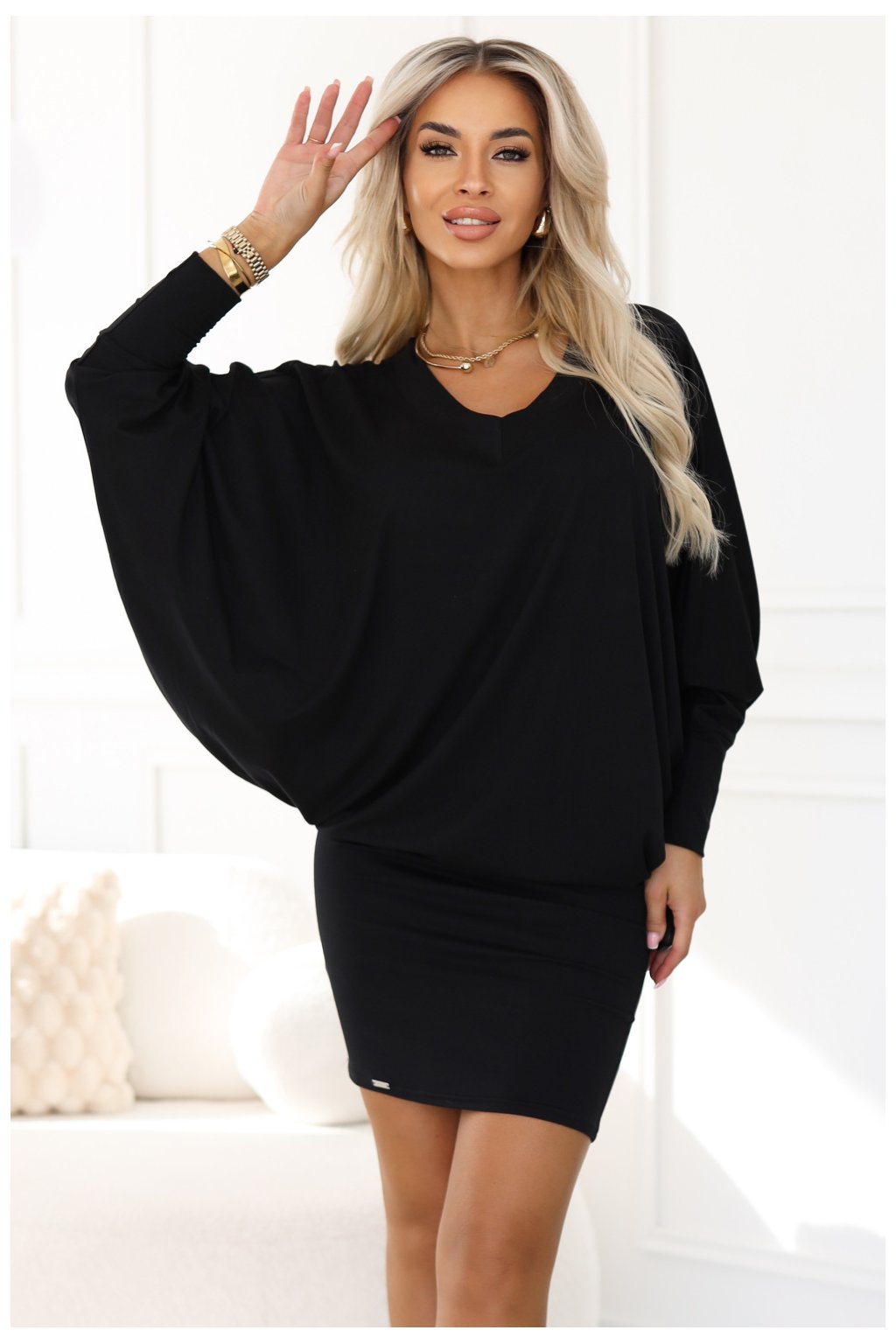 Klasické černé šaty, které spojují volnost s elegancí. Volný vrchní díl typu netopýr jemně obepíná postavu, zatímco přiléhavý spodek zdůrazňuje pas a linii boků. Toto je ten model, ke kterému sáhnete bez váhání: osvědčuje se v práci, na schůzce a při večerním vycházení. Vyrobeno z příjemného na dotek, elastického úpletu, dobře dýchá a krásně se skládá v pohybu. Jemný výstřih ve tvaru písmene V zjemňuje krk, zatímco delší rukáv přidává pohodlí v každém ročním období. Kvalita provedení zdůrazňuje původ: Výroba v Polsku.