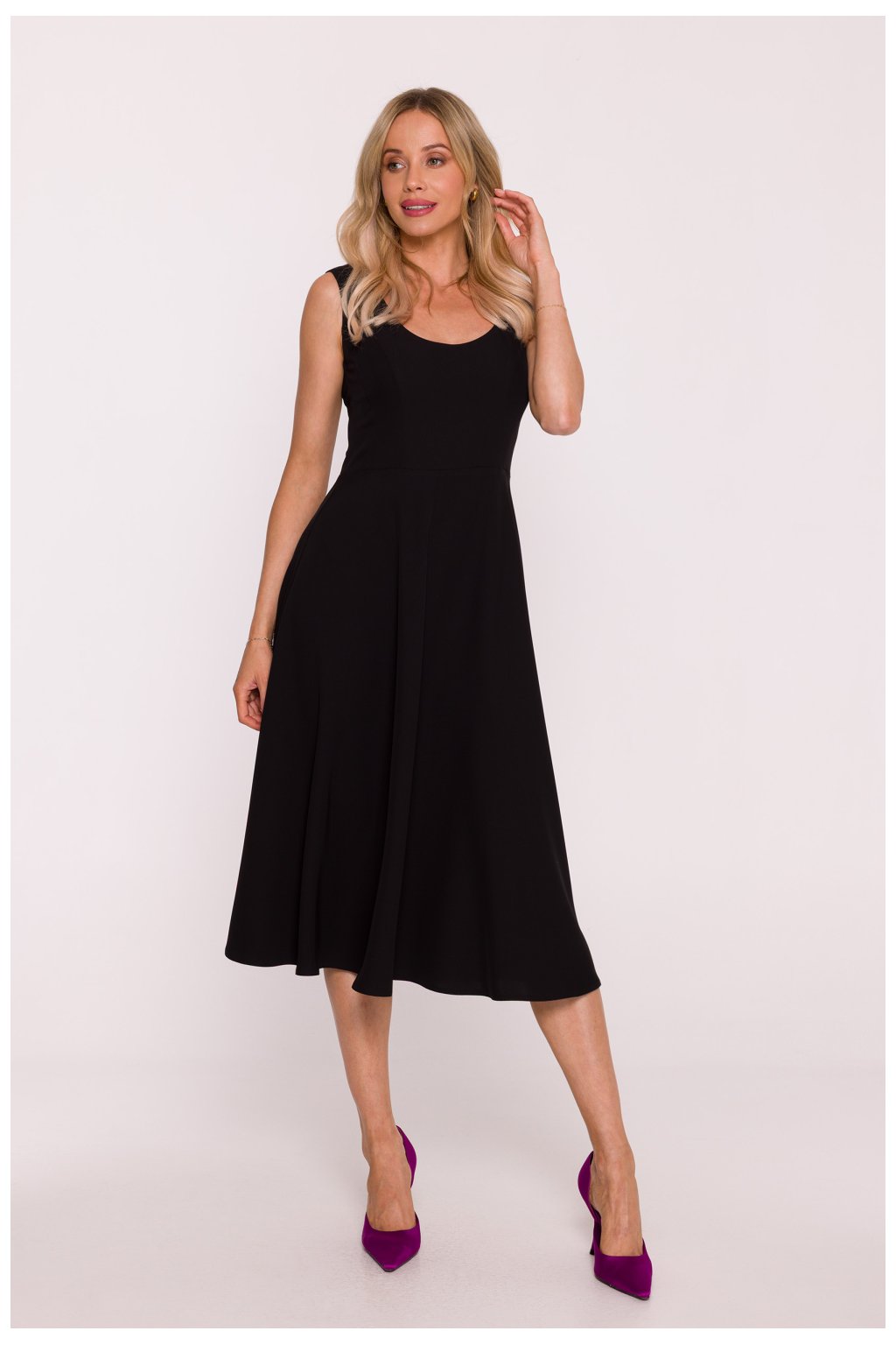 Klasické rozkročené šaty jsou kvintesencí ženské elegance a nadčasového stylu. Vyrobené z hladké látky s jemným leskem krásně odrážejí světlo a jemně zdůrazňují charakter stylizace. Model má jednoduchý, kulatý výstřih a bezrukávový střih, díky čemuž vypadá lehce a elegantně. Přiléhavý vrchní díl plynule přechází do rozkročeného spodního dílu, který se volně usazuje při každém pohybu, dodávajíce siluetě grády a lehkosti. Pas je zdůrazněn přesným střihem, který opticky zúží postavu a zdůrazní její proporce. Na zádech je skrytý zip, který zajišťuje pohodlné oblékání a hladké dokončení. Navrženo a ušito v Polsku s důrazem na detaily a kvalitu zpracování.