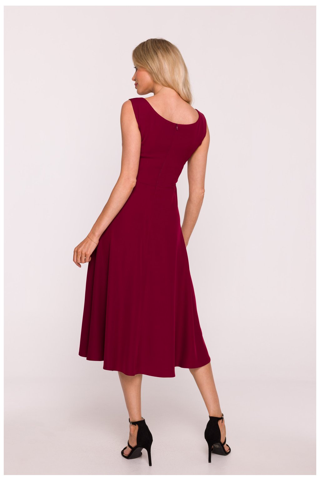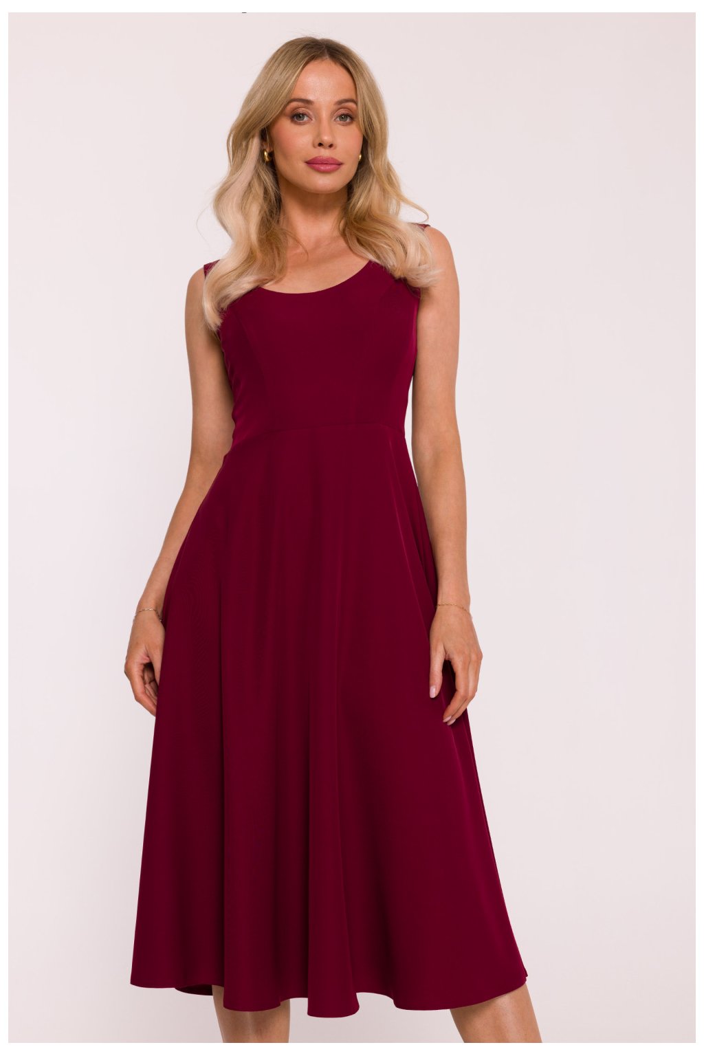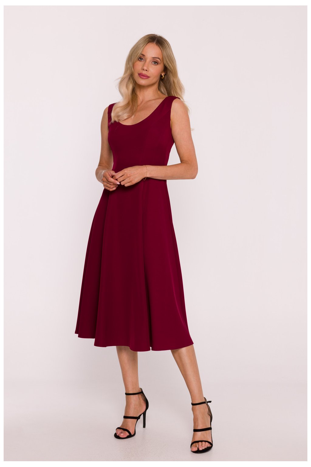 Klasické rozkročené šaty jsou kvintesencí ženské elegance a nadčasového stylu. Vyrobené z hladké látky s jemným leskem krásně odrážejí světlo a jemně zdůrazňují charakter stylizace. Model má jednoduchý, kulatý výstřih a bezrukávový střih, díky čemuž vypadá lehce a elegantně. Přiléhavý vršek plynule přechází v rozkročený spodek, který se volně skládá při každém pohybu, dodávající postavě grácii a lehkost. Pas je zdůrazněn přesným střihem, který opticky zeštíhlí postavu a zdůrazní její proporce. Na zádech je skrytý zip, který zajišťuje pohodlné oblékání a hladké zakončení. Navrženo a ušito v Polsku s důrazem na detaily a kvalitu provedení.