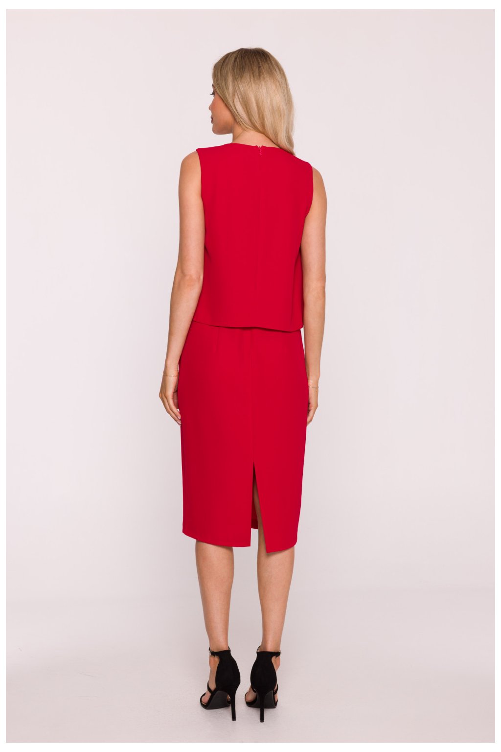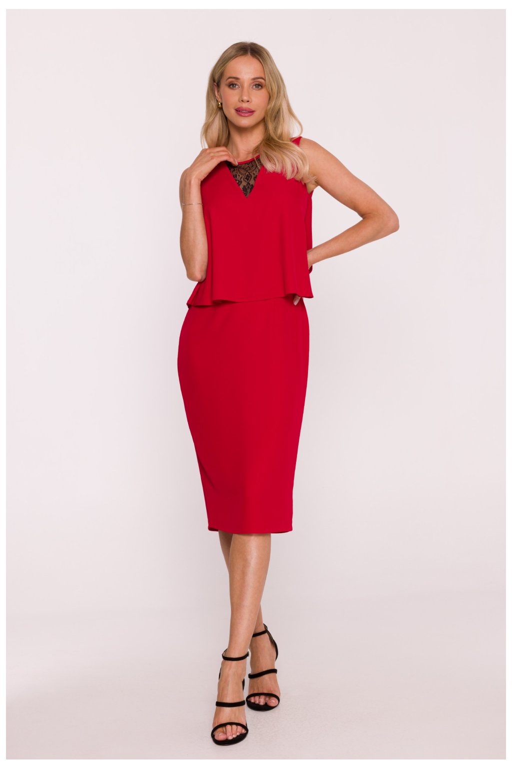 Elegantní tužkové šaty s dvouvrstvým vrchem jsou kombinací elegance, ženskosti a jemné elegance. Vyrobené z hladké látky s jemným leskem krásně zdůrazňují postavu, zachovávajíce zároveň lehkost a pohodlí nošení. Model okouzluje výstřihem ve tvaru písmene V, zdobeným vložkou z jemné krajky, která přidává celku romantický charakter. Bezrukávový střih dodává šatům lehkost, a dvouvrstvý vrch s volně padající vrstvou materiálu jemně zakrývá oblasti pasu a boků, vytvářejíc harmonickou siluetu. Tužkový spodek je přizpůsoben tělu a zakončen rozparkem vzadu, který zajišťuje pohodlnost pohybů. Šaty se zapínají na dva skryté zipy vzadu, což zaručuje ideální přizpůsobení a estetické provedení. Navrženo a ušito v Polsku s důrazem na každý detail.