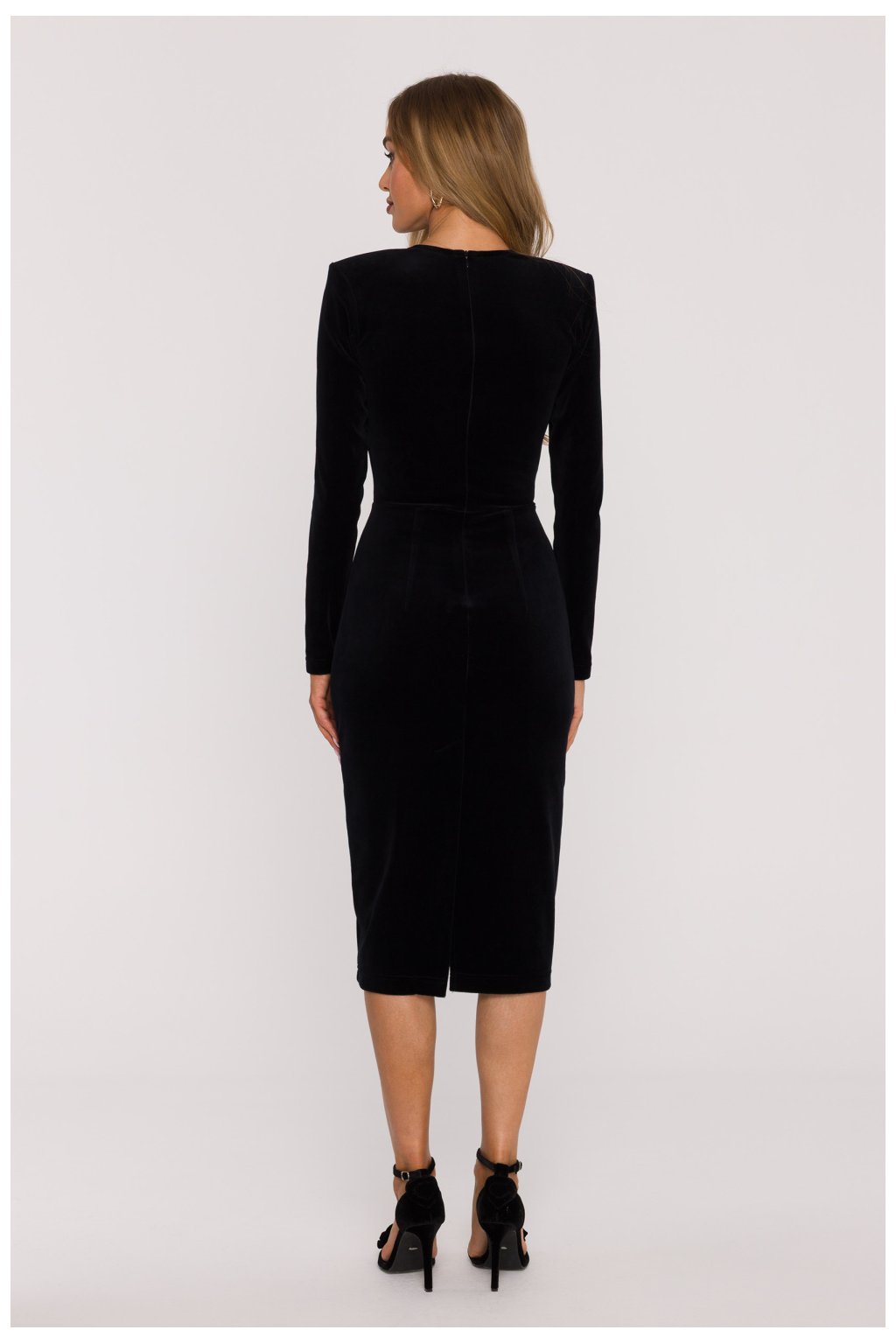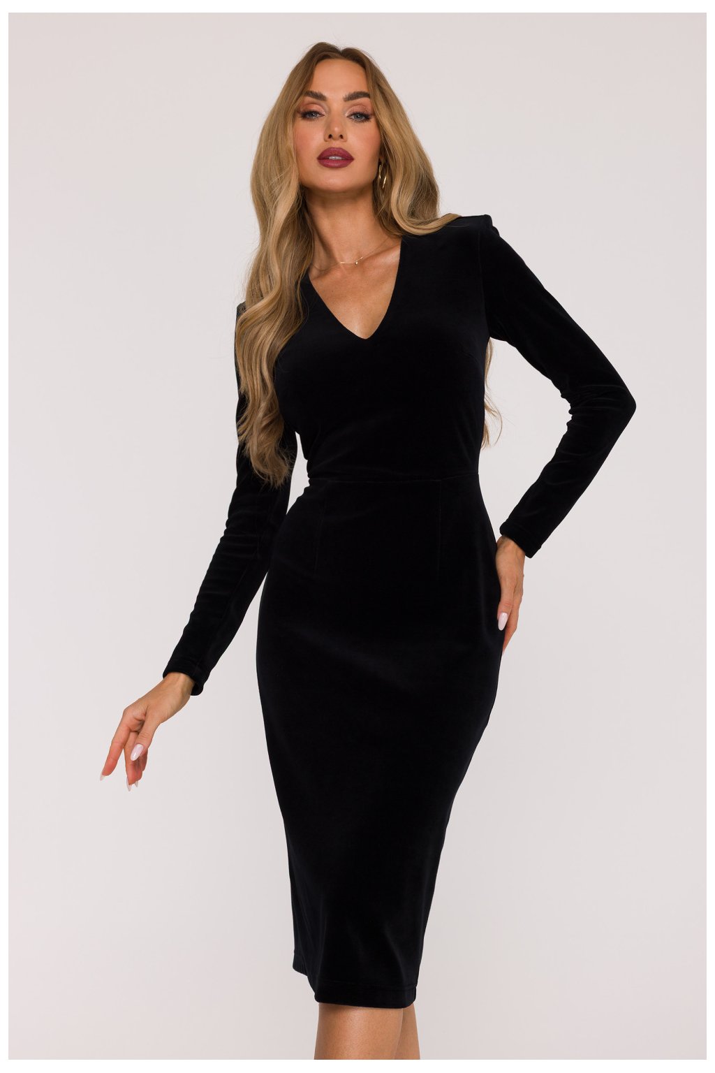 Klasické a smyslné sametové midi šaty, které spojují eleganci s nadčasovou jednoduchostí. Vyrobena z měkkého, příjemného na dotek sametového úpletu, krásně odráží světlo, vytvářejíc subtilní, luxusní lesk. Model okouzluje hlubokým výstřihem do šípu, který zdůrazňuje ženskou siluetu a dodává celku eleganci. Dlouhé, přímé rukávy přinášejí rovnováhu do střihu, dodávají mu elegantní a vyvážený charakter. Šaty mají přiléhavý olověný střih, s výrazně zvýrazněnou talií a délkou za koleno, co opticky zjemňuje postavu a dokonale se hodí jak do večerních stylizací, tak na výjimečné události. Model nemá kapsy ani podšívku, díky čemuž si zachovává lehkost a pružnost. Skrytý zip vzadu usnadňuje oblékání a zajistí ideální přizpůsobení tělu. Šaty navrženy a vyrobeny v Polsku s péčí o každý detail, ideální volba pro ženy, které oceňují klasickou eleganci a pohodlí nošení.