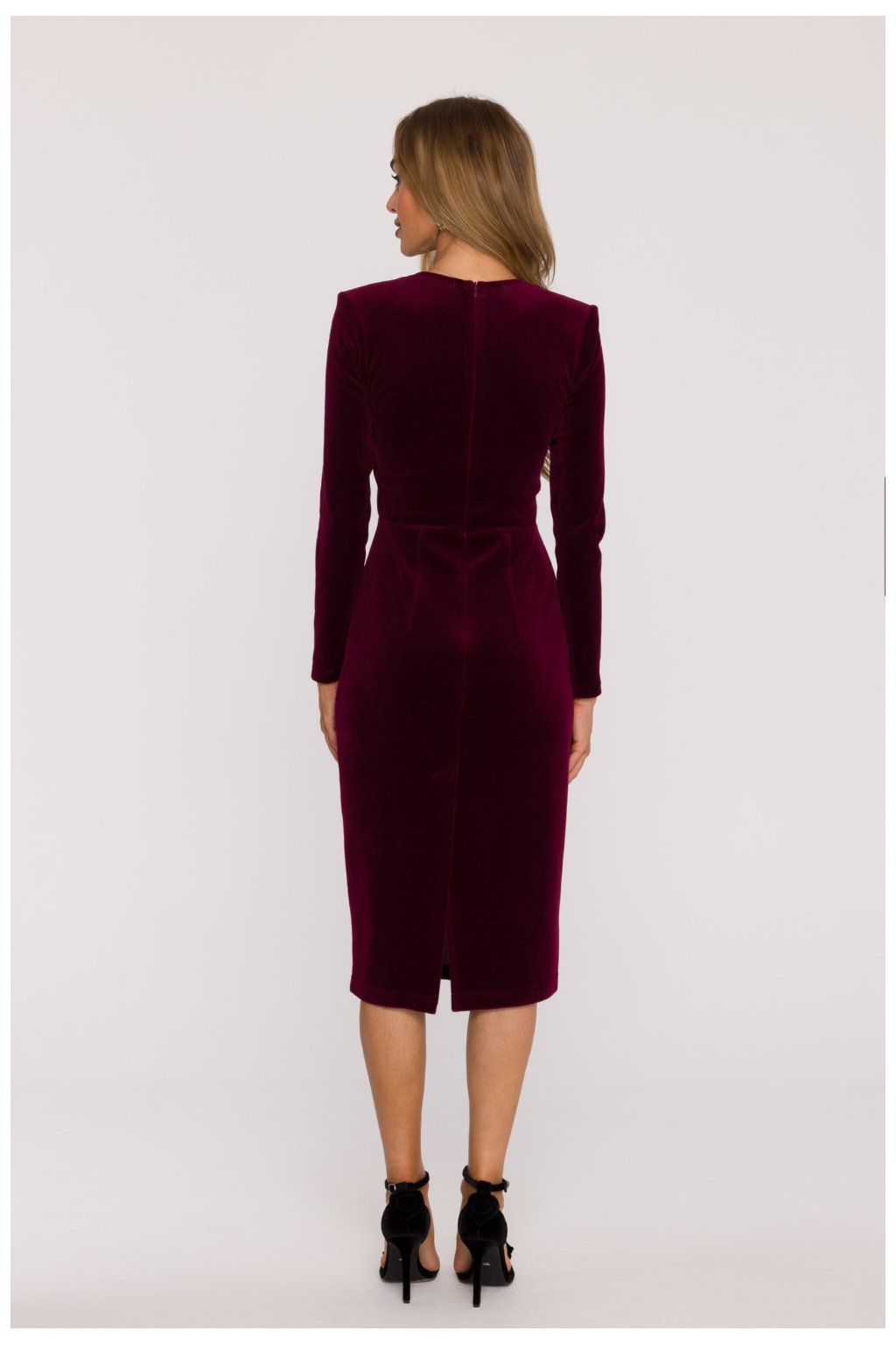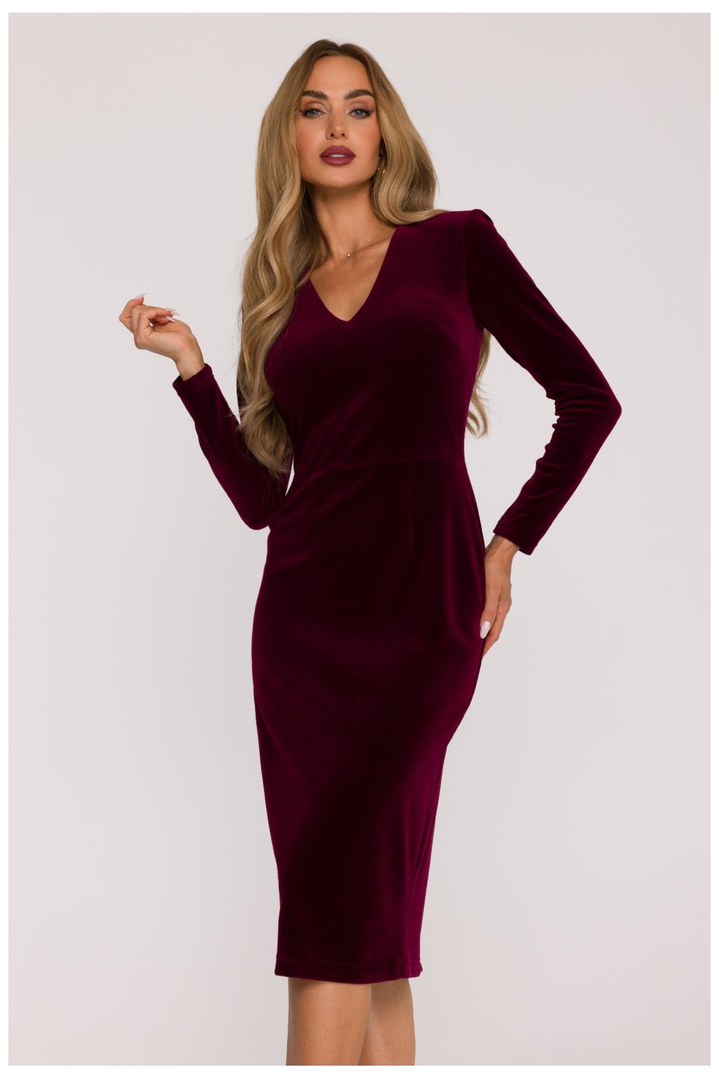 Klasické a smyslné středně dlouhé sametové šaty, které spojují eleganci s nadčasovou jednoduchostí. Vyrobena z měkkého, příjemného na dotek sametového úpletu, krásně odráží světlo, vytváří subtilní, luxusní lesk. Model okouzluje hlubokým výstřihem do srdce, který zdůrazňuje ženskou siluetu a dodává celku eleganci. Dlouhé, přímé rukávy přinášejí rovnováhu do střihu, dodávají mu elegantní a vyvážený charakter. Šaty mají přiléhavý olivový střih, s jasně vyznačenou talií a délkou za koleno, co opticky zúží postavu a bude skvěle ladit jak do večerních stylizací, tak na speciální příležitosti. Model nemá kapsy ani podšívku, díky čemuž si zachovává lehkost a pružnost. Skrytý zip vzadu usnadňuje oblékání a zajišťuje dokonalé přizpůsobení tělu. Šaty navrženy a ušity v Polsku s pečlivostí o každý detail, ideální volba pro ženy, které oceňují klasickou eleganci a pohodlí nošení.