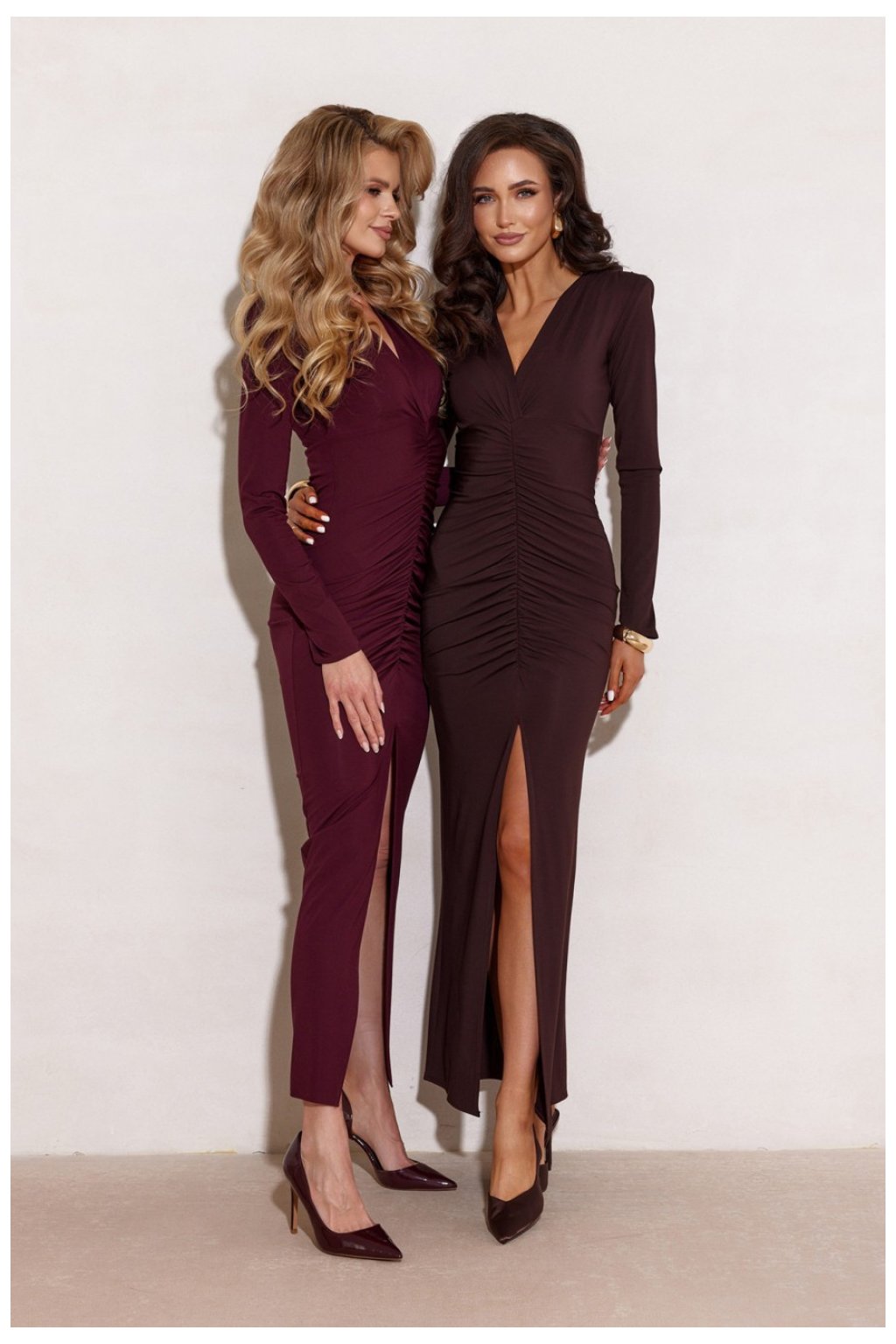 Šaty midi s výjimečně ženským střihem, s dlouhým rozparkem vpředu, který dodává lehkost a smyslný charakter. Vyrobeno z vysoce kvalitní látky, kombinace viskózy, elastanu a nylonu, skvěle se přizpůsobuje postavě, poskytující pohodlí nošení. Výstřih do srdce krásně zdůrazňuje linii krku a jemné rýhy vpředu opticky modelují postavu. Dlouhé rukávy a polštářky na ramenou dodávají celku elegantní, moderní vzhled. Šaty byly navrženy a ušity v Polsku, co zaručuje nejvyšší kvalitu provedení a pečlivost o každý detail. Ideální jak na výjimečné události, tak i večerní vycházky stačí vybrat vhodné doplňky, aby vytvořily plně elegantní stylizaci.
