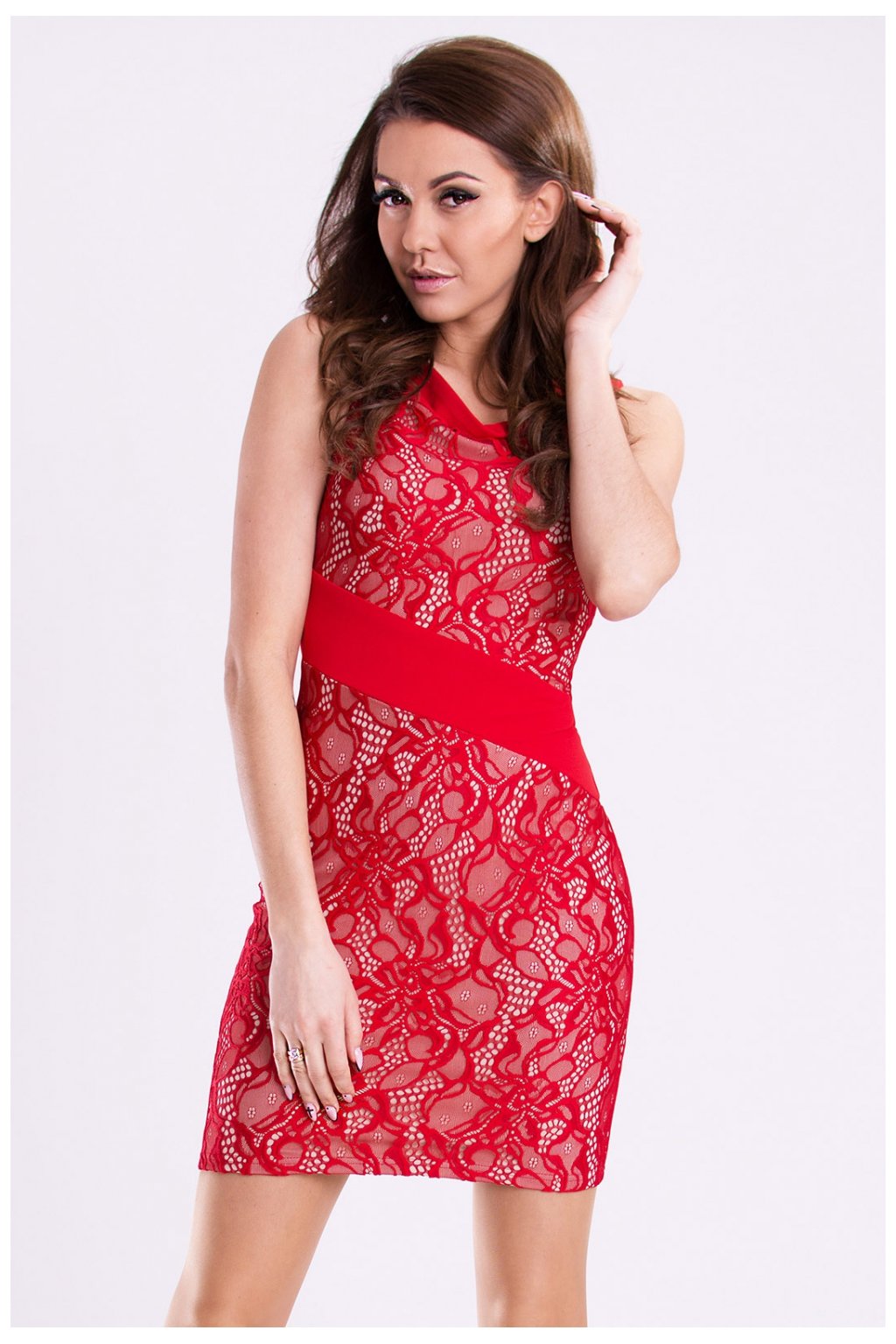 Krátké šaty na míru v červené barvě. Vpředu našitá krajka, vzadu hladká. >br> Složení: 95 % polyester, 5 % elastan