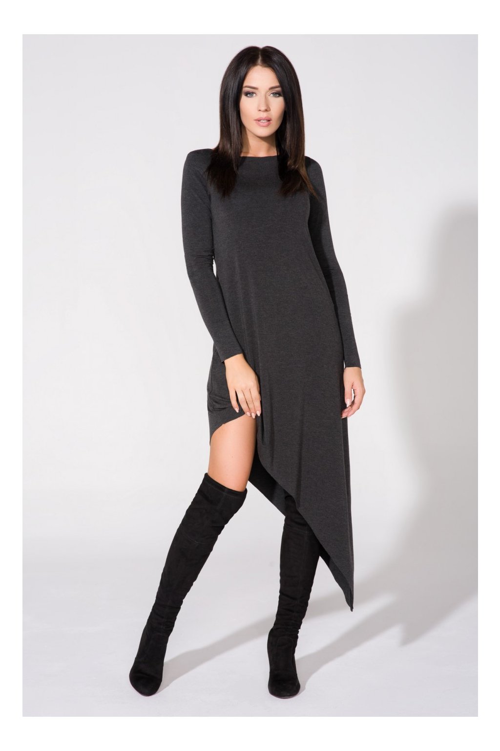 Asymetrické šaty z úpletu příjemného na dotek. Rukávy, spodní část a výstřih jsou ponechány v surovém stavu.Složení materiálu: 68% viskóza, 28% akryl, 4% elastan.