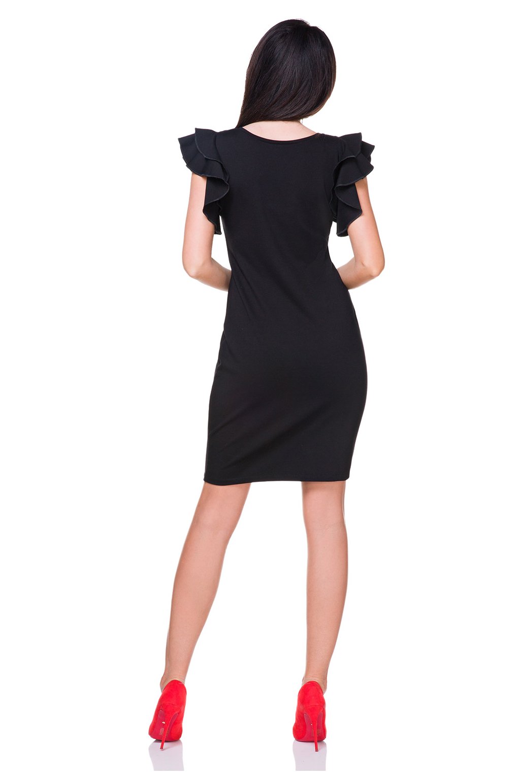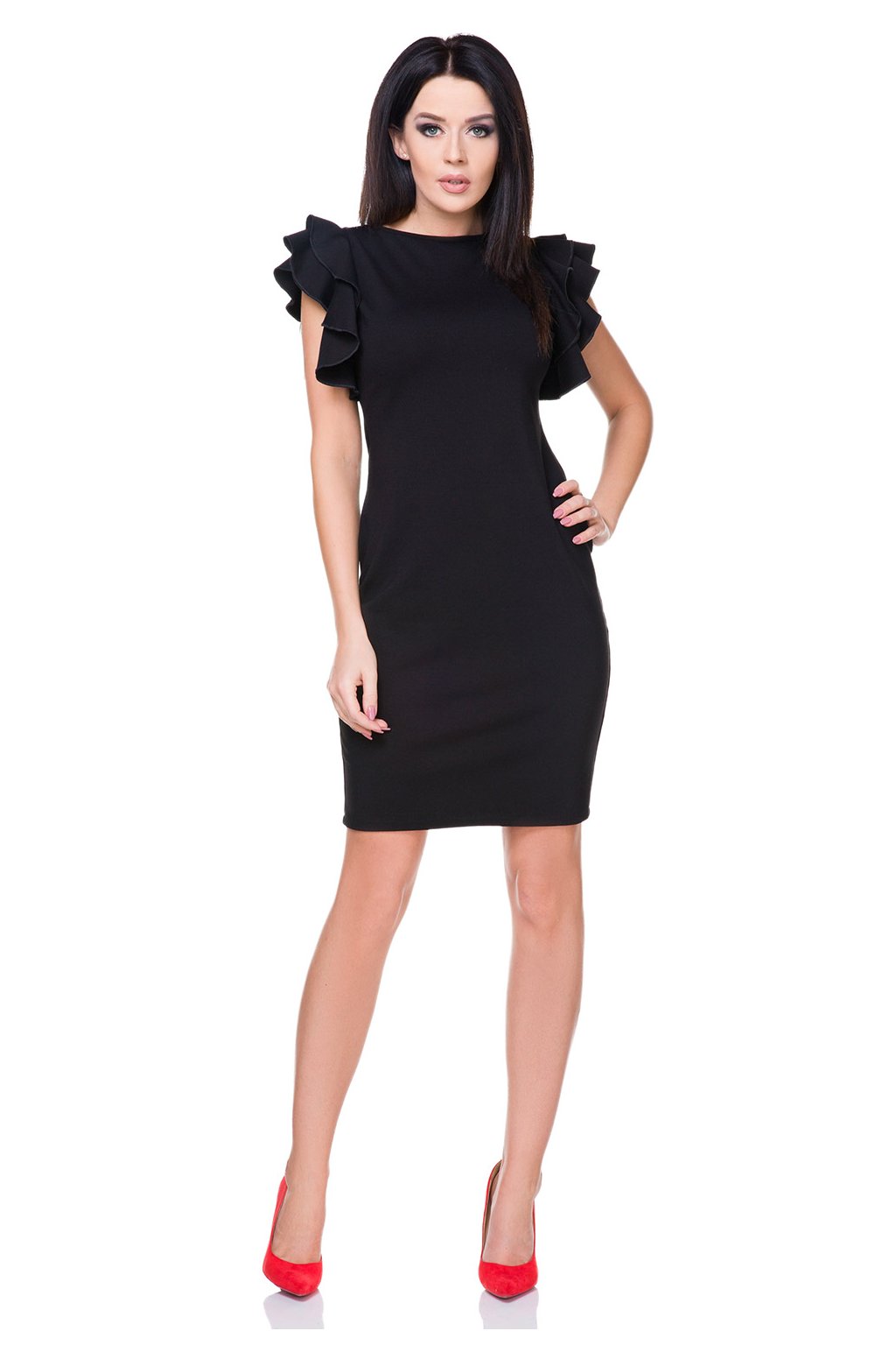 Šaty z pleteniny. Výstřih zakončený lemem. Působivý volán místo tradičních rukávů.