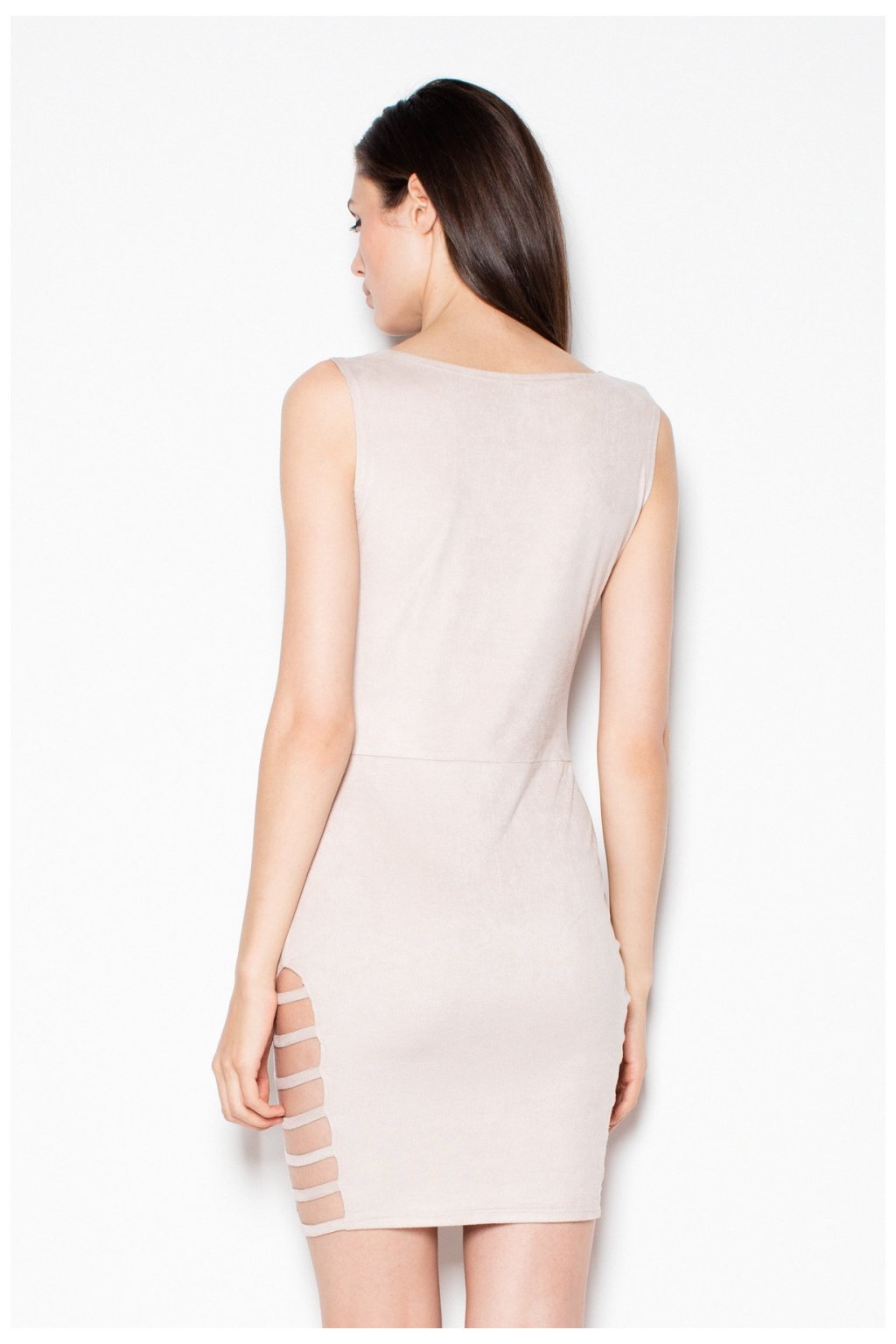 Šaty ze semišové tkaniny. Šaty mají široká ramínka a vyznačují se efektními výřezy na stehnech. Ideální pro zvláštní příležitosti.