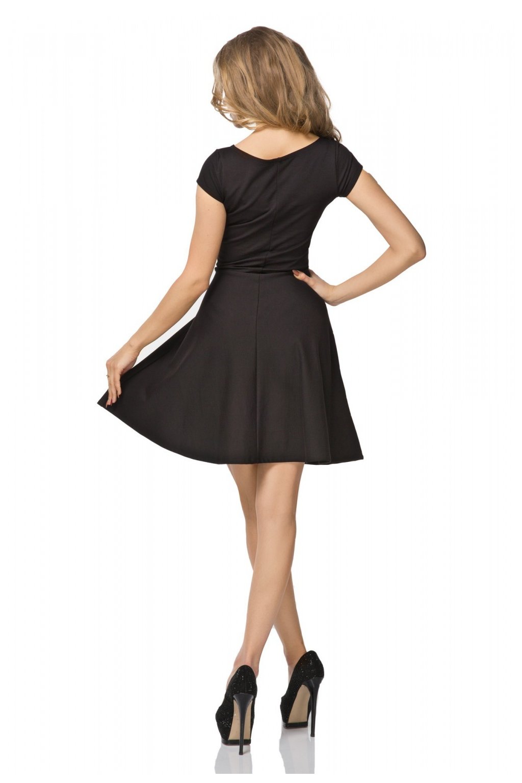 Krátké denní šaty ušité z příjemného bavlněného úpletu. Lodičkový výstřih, krátké rukávy. Odstřižený pas, rozšířená spodní část. Ideální pro teplé jarní a letní dny. Střih zdůrazňuje přednosti ženské siluety a maskuje nedokonalosti postavy.