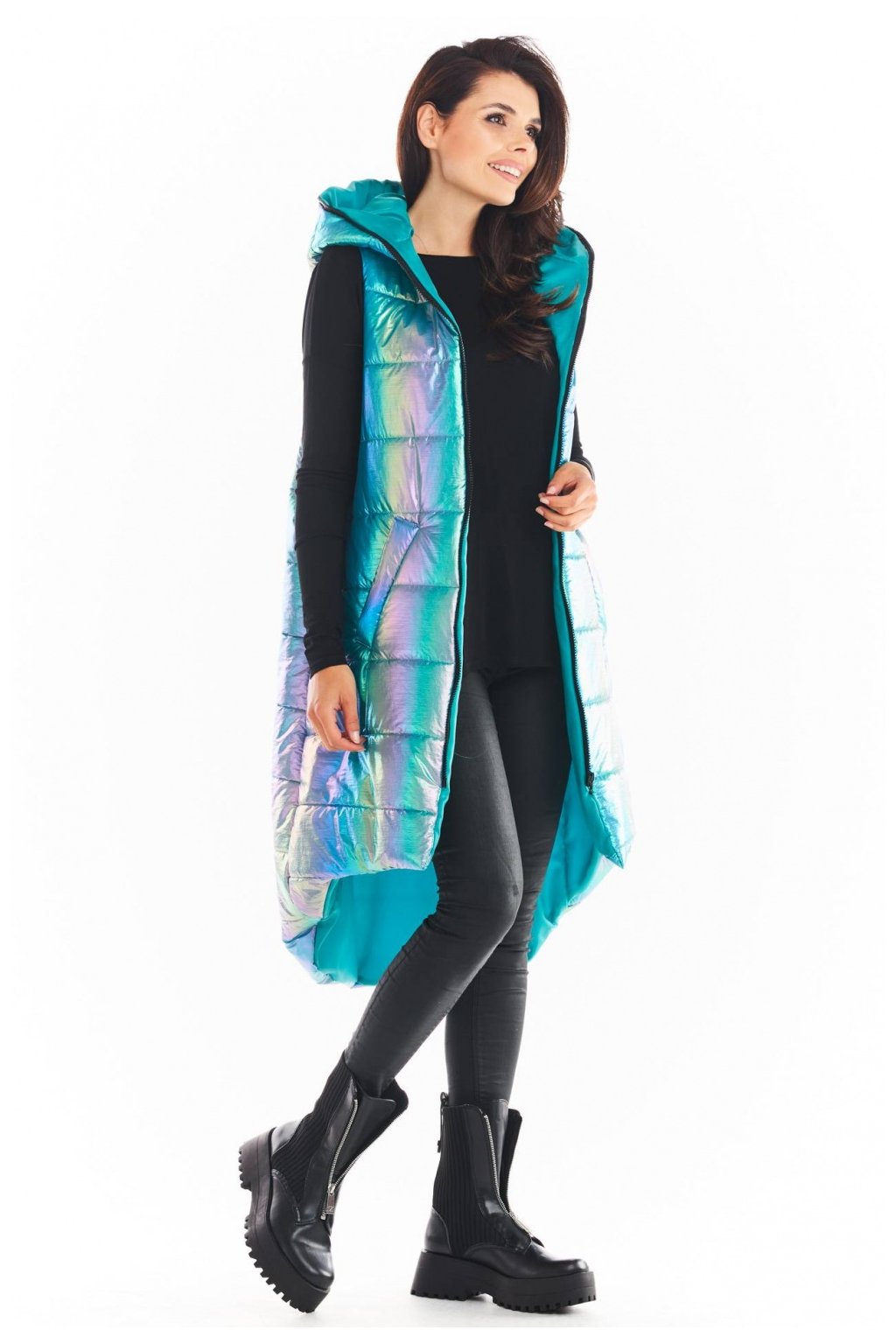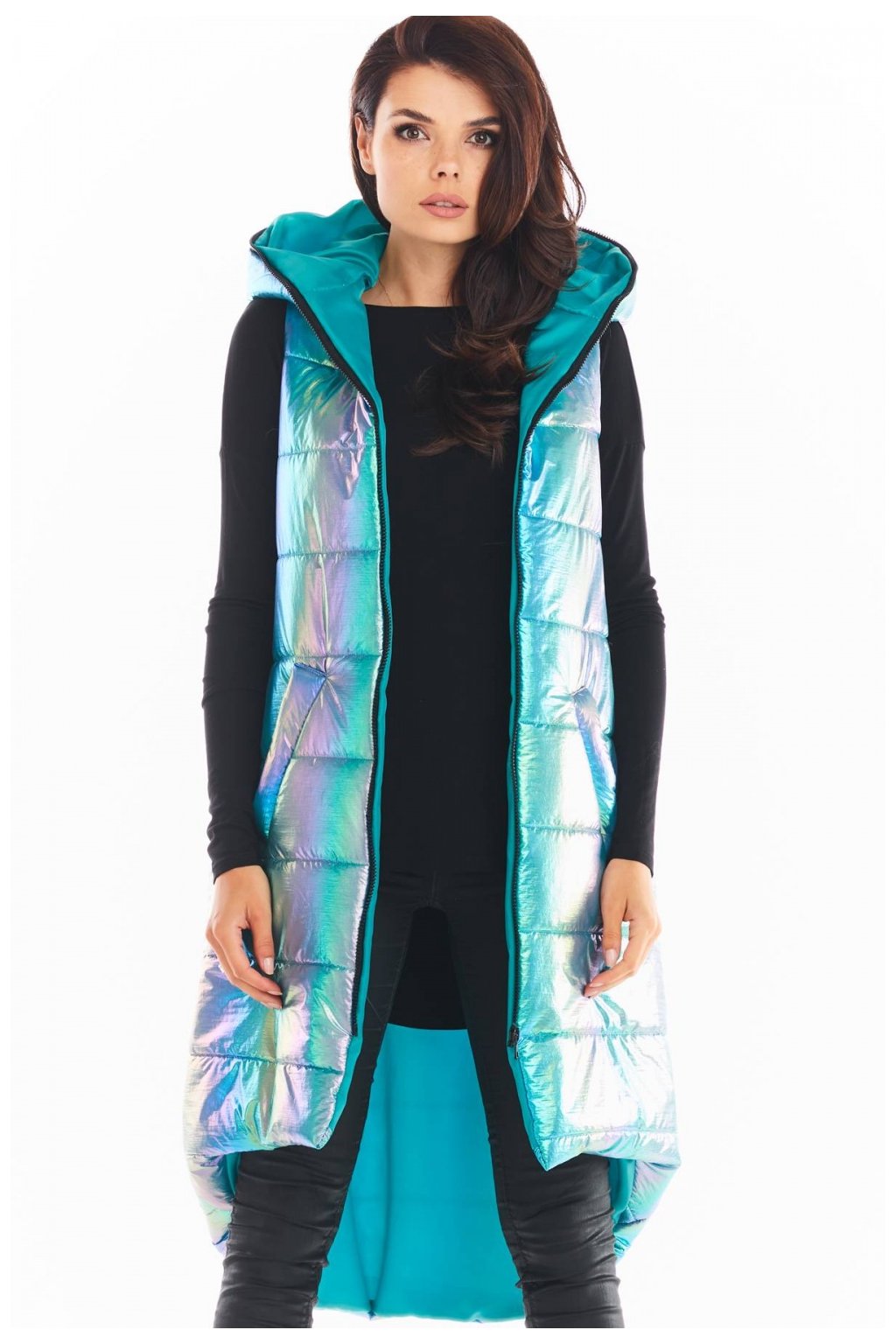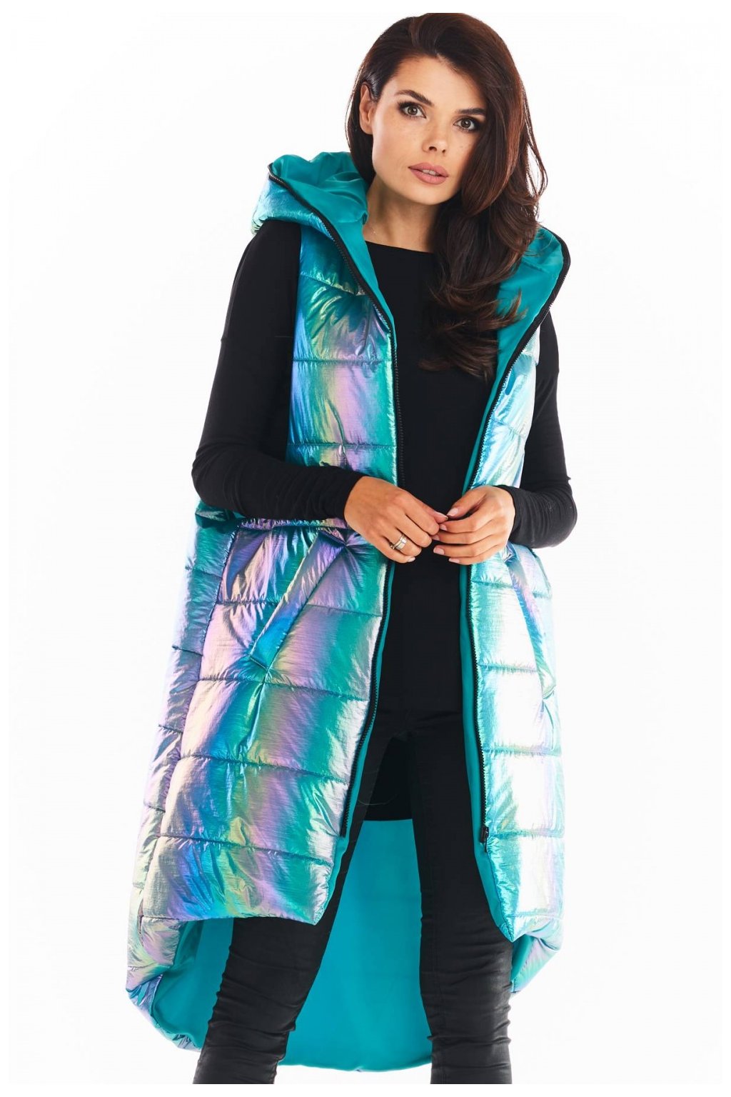 Holografická vesta s prodlouženým zadním dílem je ideální volbou pro chladné podzimní dny. Její zajímavé barvy upoutají pozornost a dodají vašemu outfitu osobitost. Zapíná se na zip, má velkou kapuci a prostorné kapsy. Dodává se ve 3 odstínech: modrém, mátovém a růžovém. Materiál: podšívka 100% polyester.