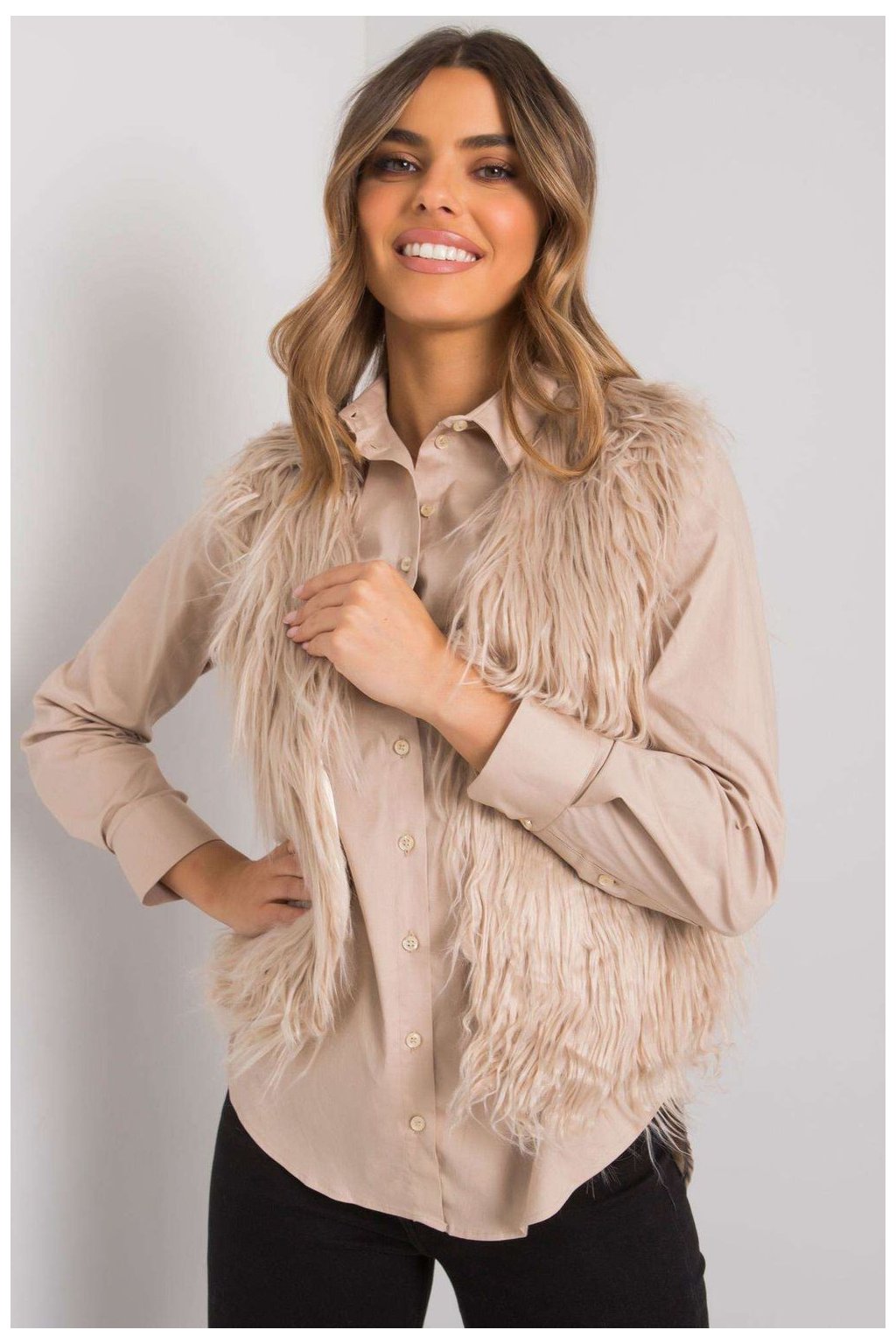 Béžová kožešinová vesta se zapínáním na háček a oko, celá podšitá.