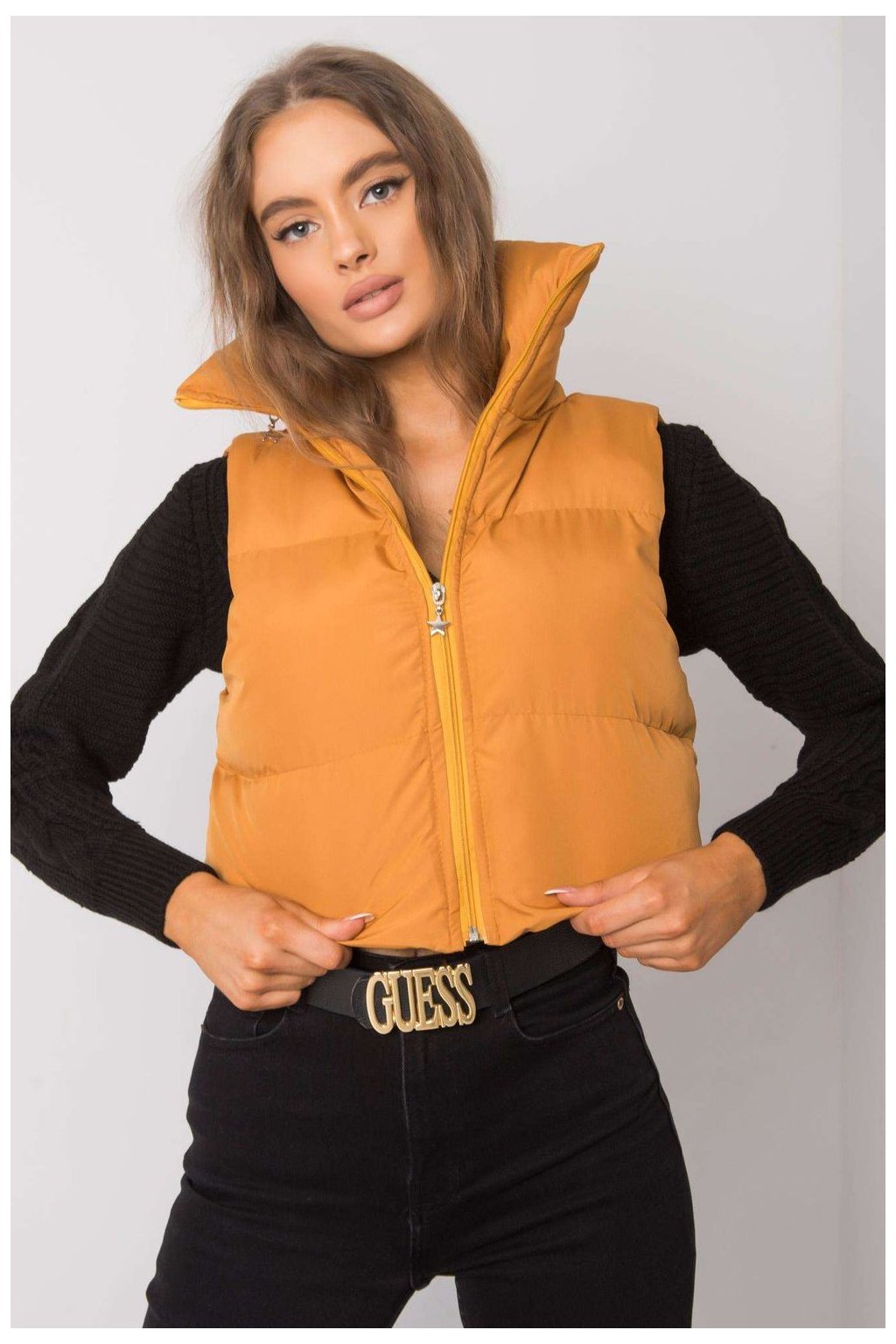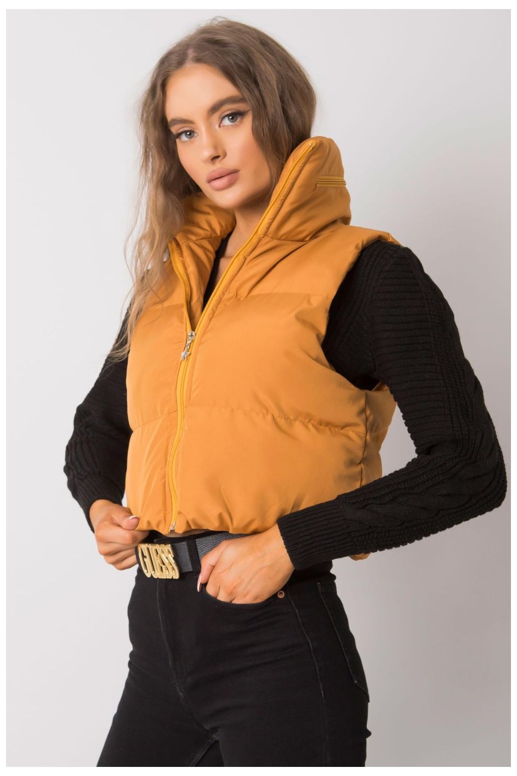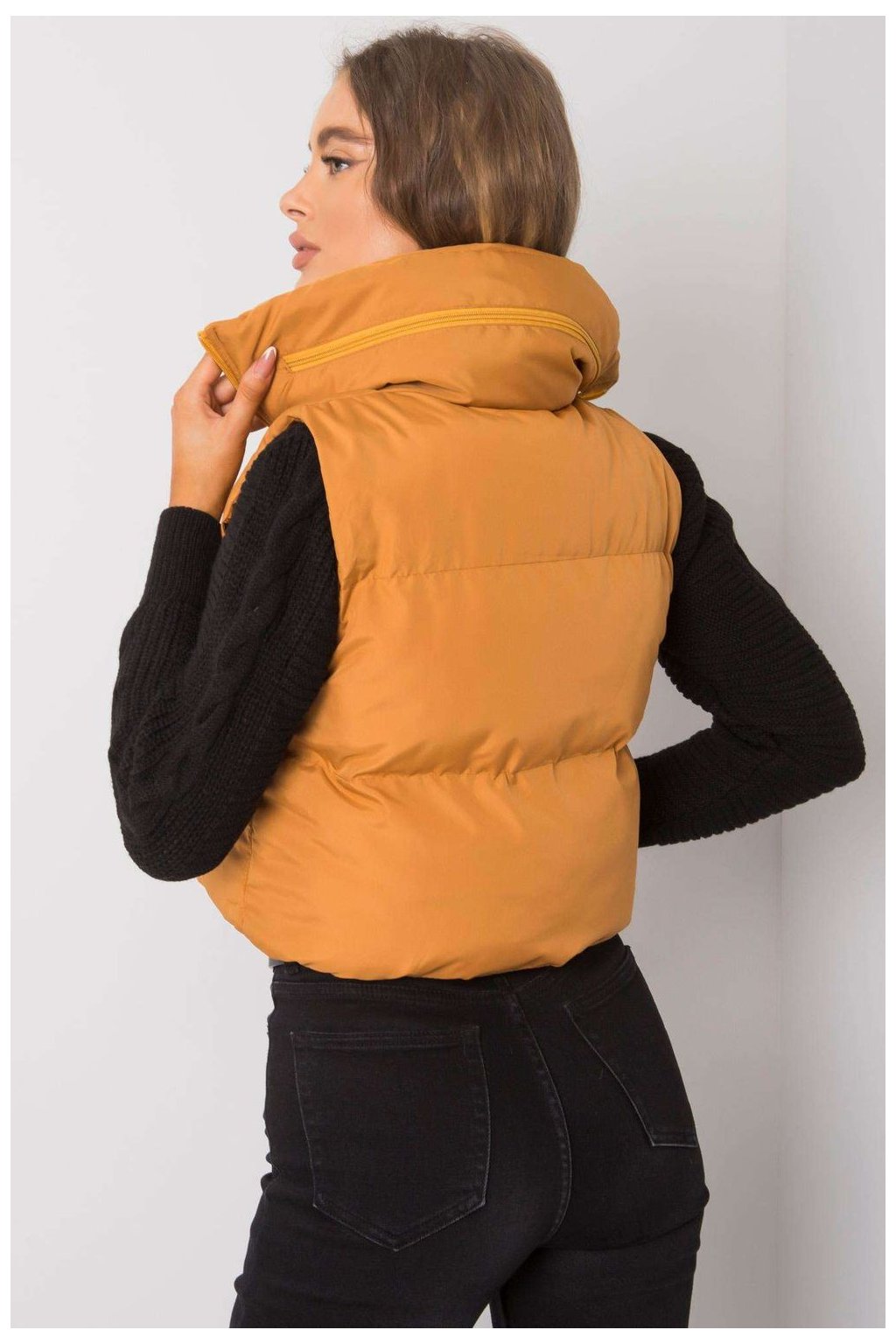Tmavě žlutá vesta se skrytou kapucí. Vesta na zip.