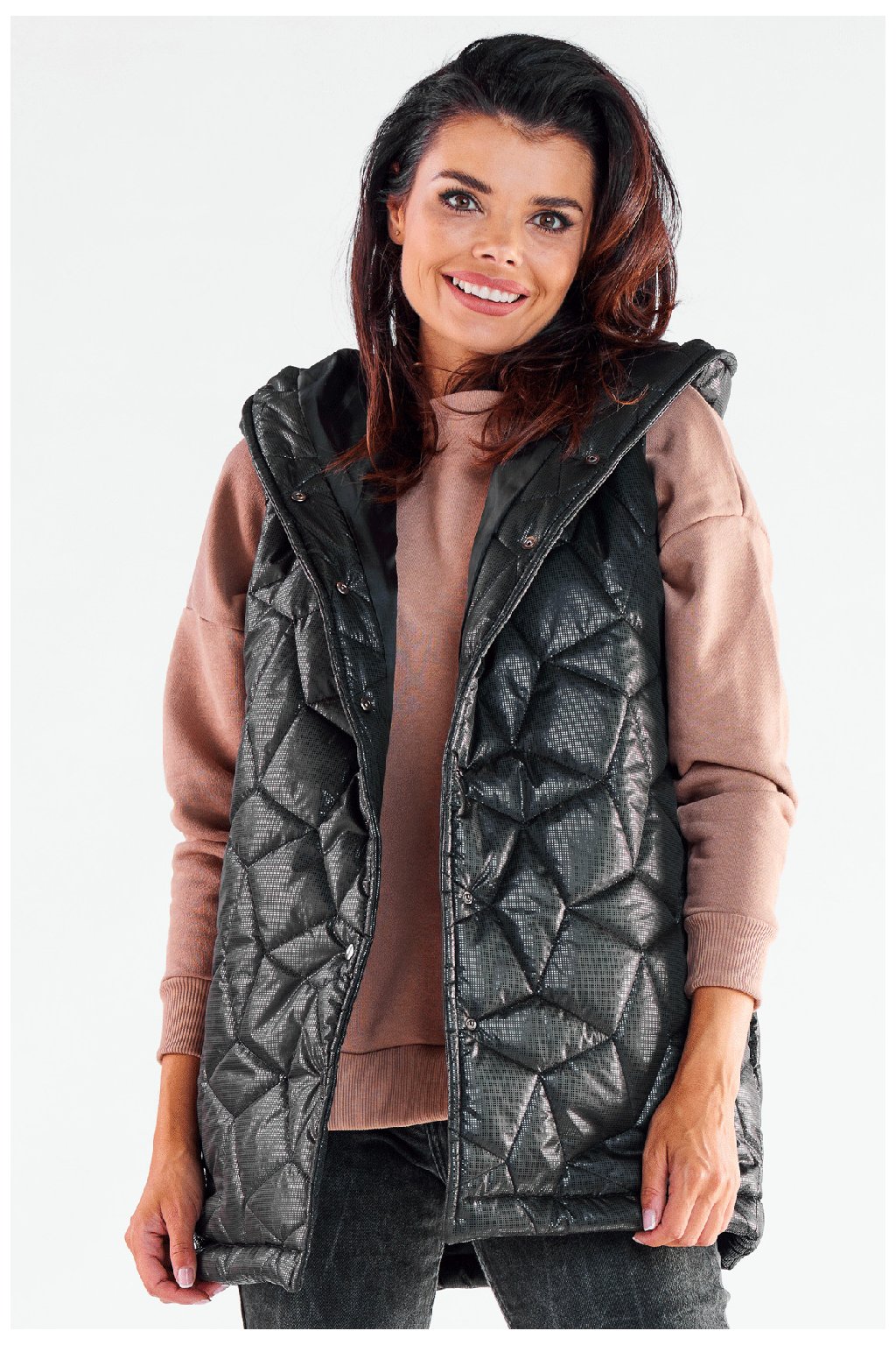 Prošívaná teplá vesta s kapucí, zapínání na patentky. Podzimní must have ve dvou barvách: černé a tmavě modré. Ideální k jakémukoli stylu oblečení. Plně podšitá vesta.
