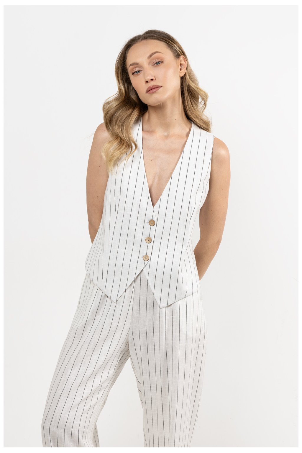 Lněná vesta v jemných pruzích Tato vesta je ideální kombinací stylu a pohodlí. Vyrobena z prodyšného lnu, zajišťuje komfort v teplých dnech. Krátký, jednoduchý střih a V-výstřih jemně zvýrazňují siluetu, zatímco bavlněná podšívka zvyšuje pohodlí nošení. Skvěle se hodí do casual a elegantních outfitů. K vestě se hodí lněné kalhoty, jak široké, tak i cigaretové. Spoj kalhoty s lněnou vestou do kompletu a vytvoř stylový oblek.