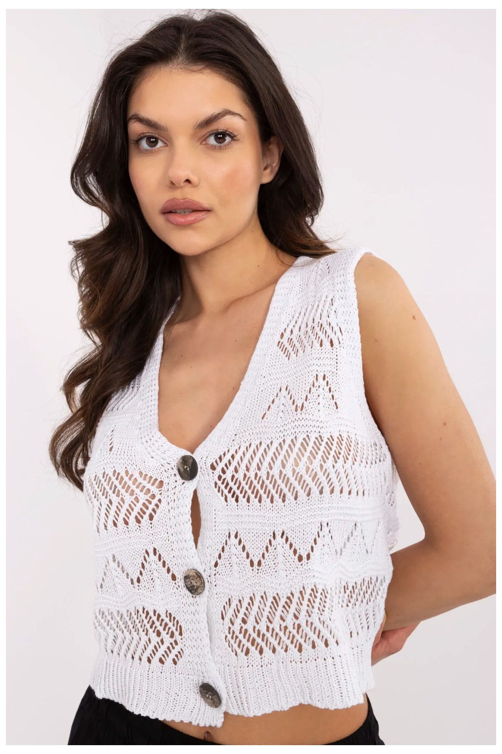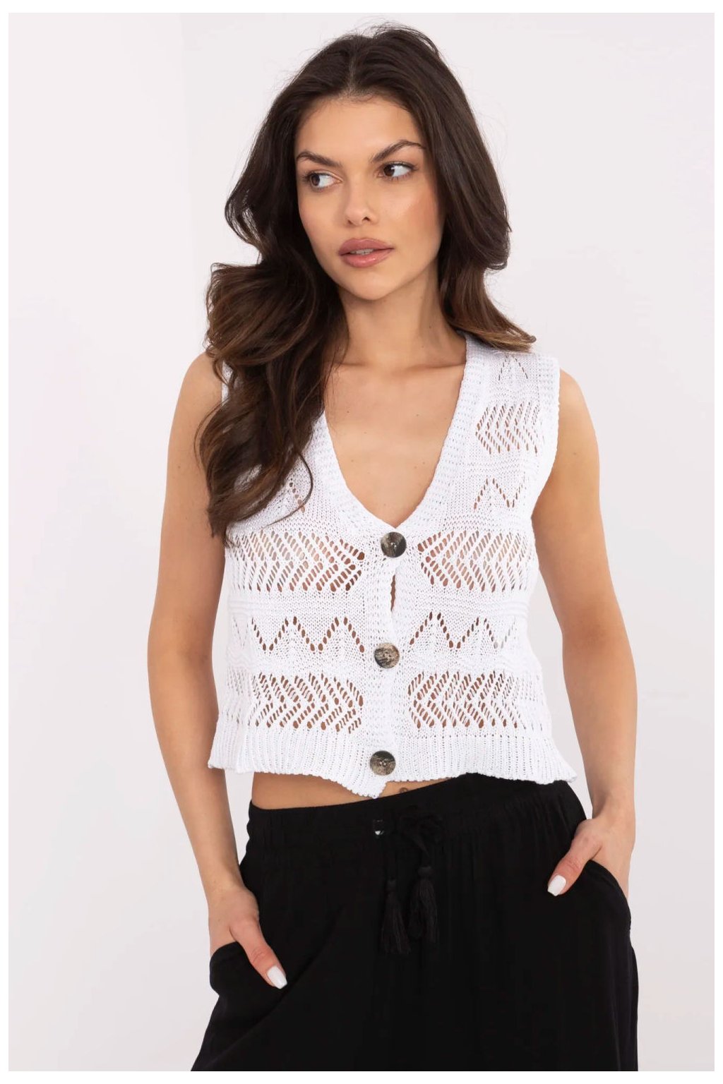 Průsvitný dámský vestička v casual stylu je módním a lehkým doplňkem každodenního oblékání. Vyrobený z směsi bavlny a polyakrylu, je příjemný na dotek, prodyšný a pohodlný k nošení. Bez rukávů, krátký model s výstřihem na srdce skvěle ladí jak s košilí, tak s jednoduchým tričkem. Průsvitný vzor dodává celku jemnost a lehkost, zatímco klasické zapínání na knoflíky zdůrazňuje volný, každodenní charakter vesty. Jedná se o univerzální návrh, který se skvěle hodí po celý rok jako doplněk mnoha stylizací.